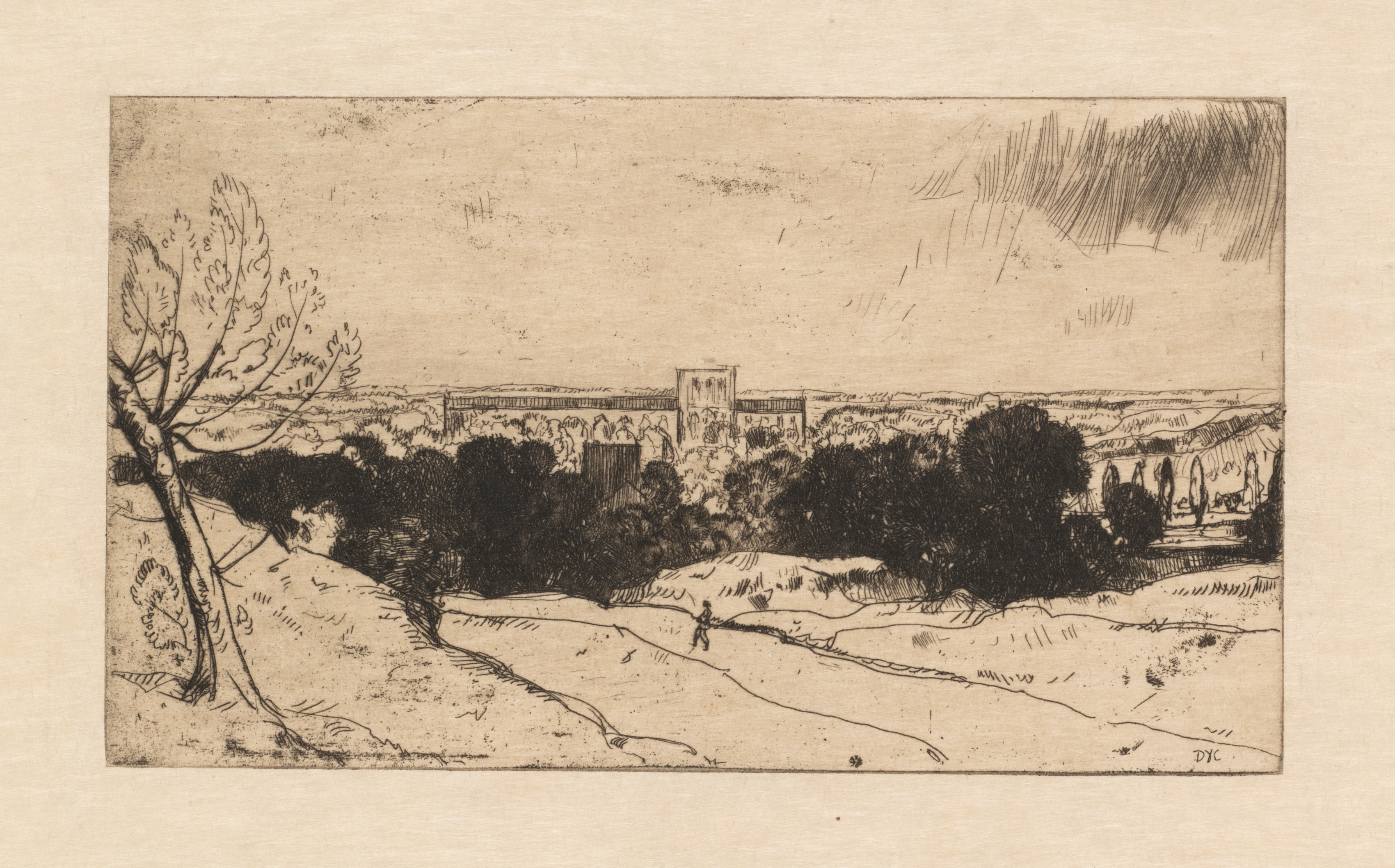 The image depicts a landscape scene. A tree with sparse leaves stands on the left. A dirt path runs from the bottom center to the bottom left. The path has several lines running across it. Dark trees are in the midground. A city with a tower in the center is in the background. The sky above has some clouds. The entire scene is rendered in shades of sepia.