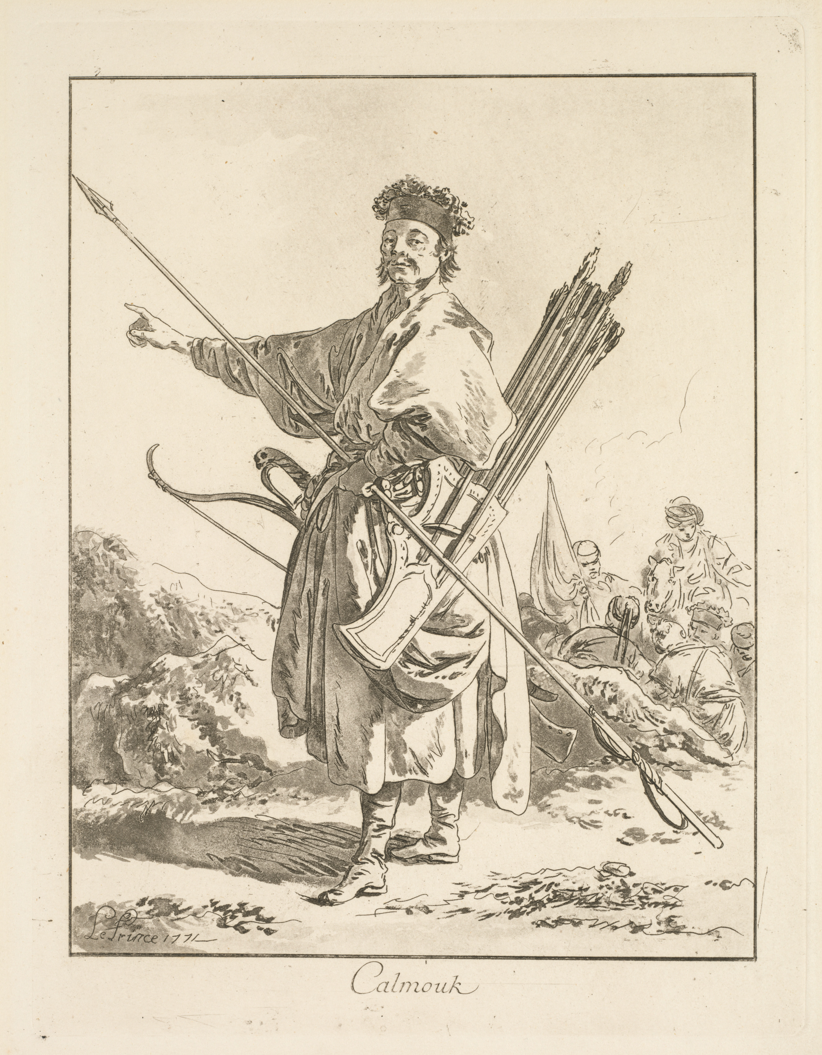 Black and white illustration of a man wearing a fur hat and robe; he carries a bow and quiver with arrows and a long spear; he stands in a dirt area with rocks and sparse foliage; three people on horseback are behind him; the image has a thin black border on aged paper.