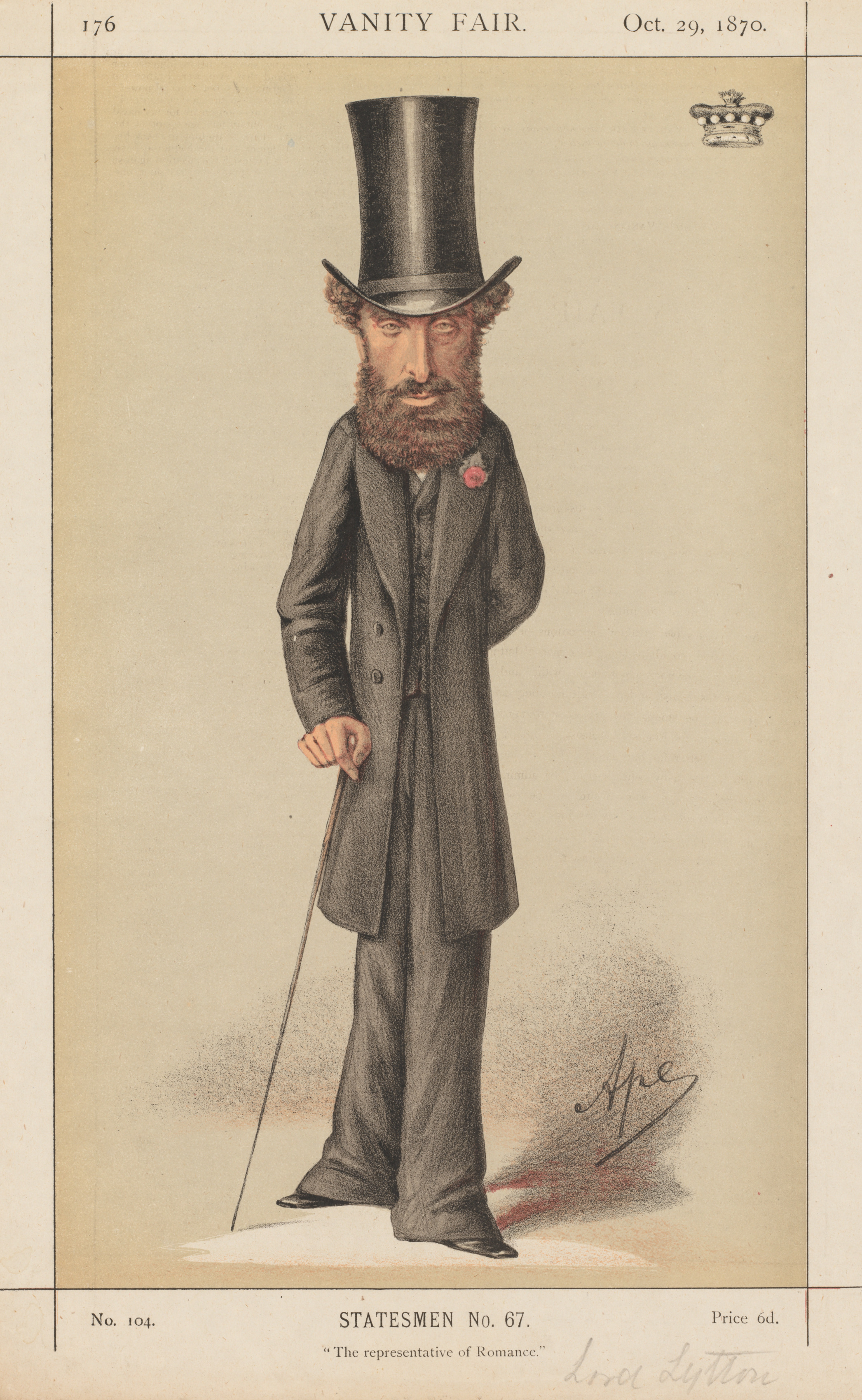 The image depicts a man wearing a long, dark-colored coat with buttons down the front, a dark tie, and a red flower on his lapel. He has curly brown hair and a thick beard. His right hand holds a cane. He wears a tall, black top hat. The man stands against a beige background. At the top of the image, "VANITY FAIR" and "Oct. 29, 1870" are printed. At the bottom, "STATESMEN No. 67. 'The representative of Romance'" is printed. A crown logo is in the upper right corner. The image is framed by thin black lines.