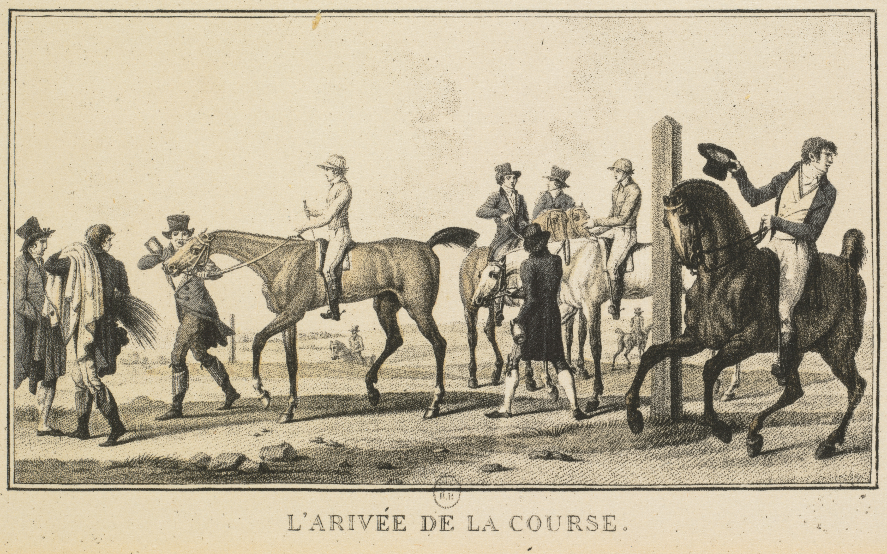 The image features an old drawing depicting a scene with men and horses. The scene shows several men on horseback and on foot. There are four horses present; one brown horse with a jockey on its back is being led by a man on the left, a white horse with two people on it appears in the middle, and a dark brown horse on the right with a man riding it. The men are dressed in 19th-century attire, including top hats, long coats, and boots. The background of the image has faint details. The bottom of the image features a line of text in French, reading "L'ARRIVEE DE LA COURSE". The image is rendered in shades of brown and black. The image has a thin border.