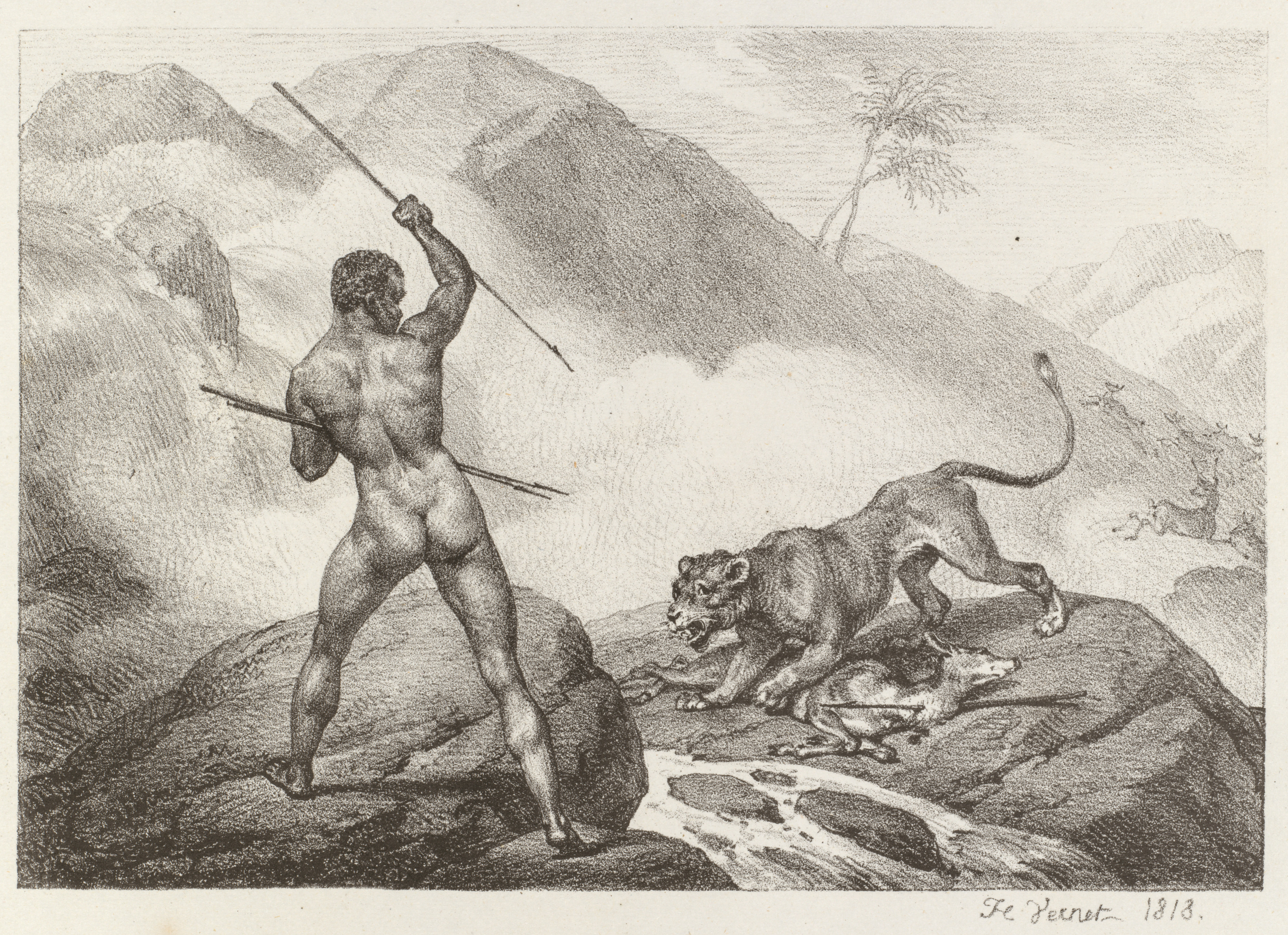 The image shows a black and white drawing titled "African Hunter (Chasseur Africain)" by Horace Vernet. The man in the image is standing on a rocky outcropping with his back to the viewer. He is naked and holding two spears. One spear is held up in the air, while the other is tucked under his arm. He has short hair and is standing with his legs apart. To the right of the man, a large cat, possibly a lioness, is attacking a dead or dying animal on the ground. The cat's mouth is open, and it appears to be biting the animal. In the background, there are mountains and a palm tree. The sky is cloudy, and there is a sense of movement in the scene, with the man and the cat in dynamic poses. The drawing is detailed and textured, with shading and cross-hatching used to create depth and dimension.