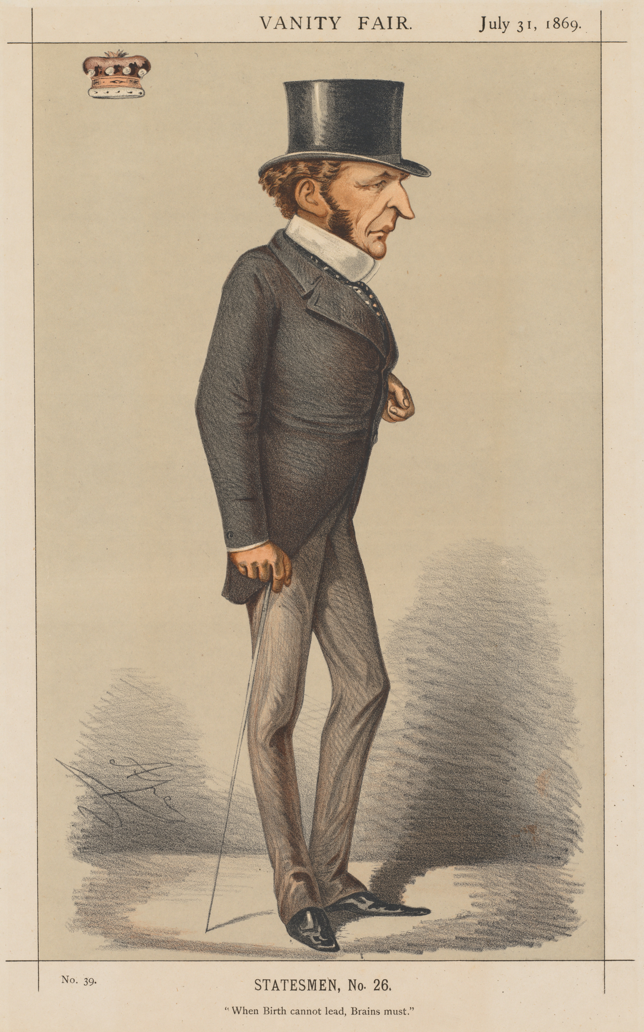 The image is a Vanity Fair illustration of a man in a top hat and formal attire. The man wears a black top hat, a dark gray jacket with a white collared shirt underneath, a dark tie with white polka dots, light-colored pants, and black shoes. He holds a cane in his right hand. The man has short, curly brown hair and a beard and mustache. The background is beige with darker shading behind the man. Across the top of the image are the words "VANITY FAIR" and a date "July 31, 1869." At the bottom, it reads "STATESMEN, No. 26" and a quote, "When Birth cannot lead, Brains must."