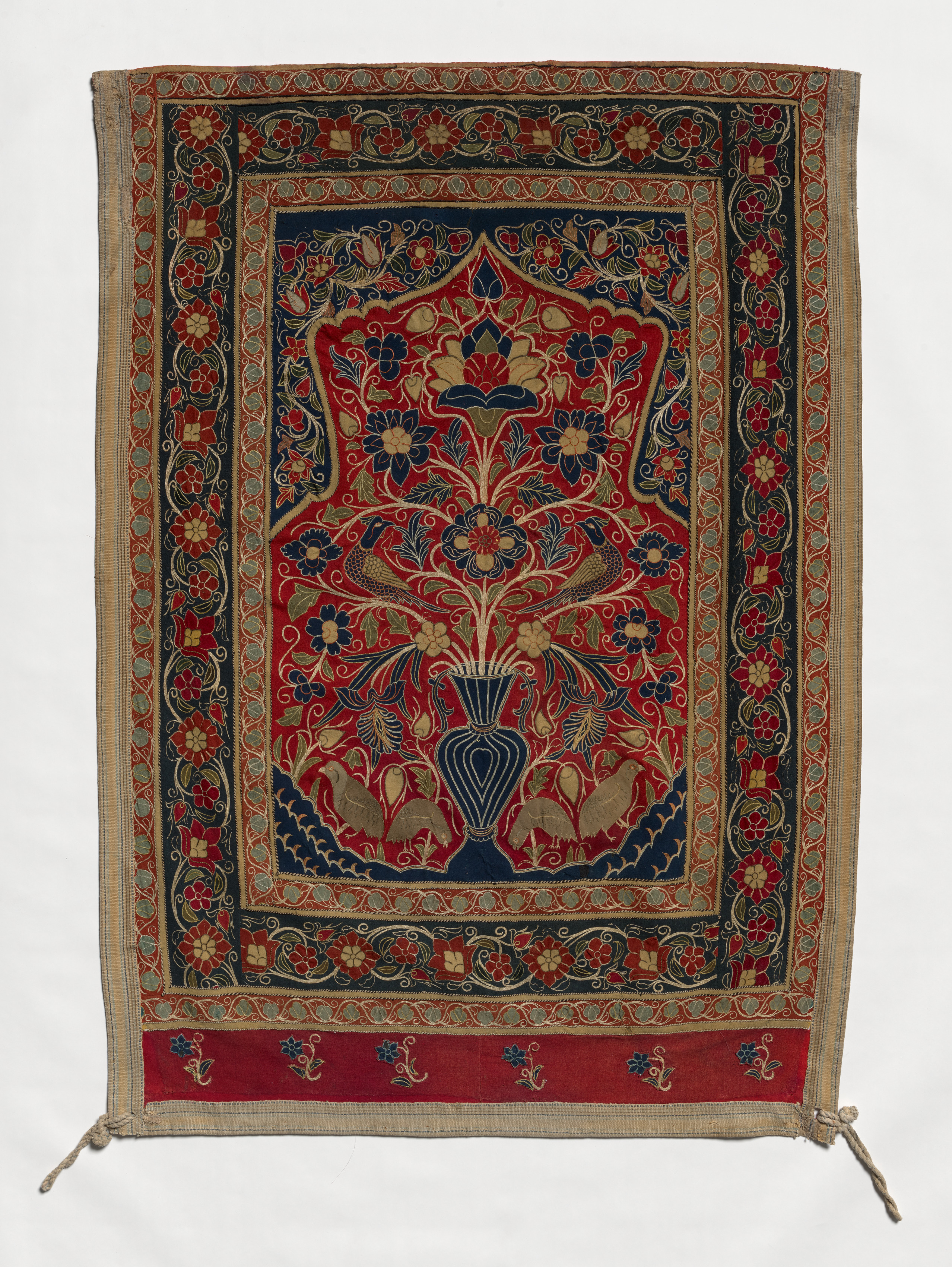 Red, blue, and gold-colored textile with a symmetrical design. The center has a blue vase with a floral arrangement, surrounded by birds and a leafy design. The center design is inside a red and blue border with a gold outline. The outermost border is red and blue with a gold outline. The bottom has a red panel with blue and gold designs. The textile has tassels on the bottom. The artwork is by Muhammad Shah.
