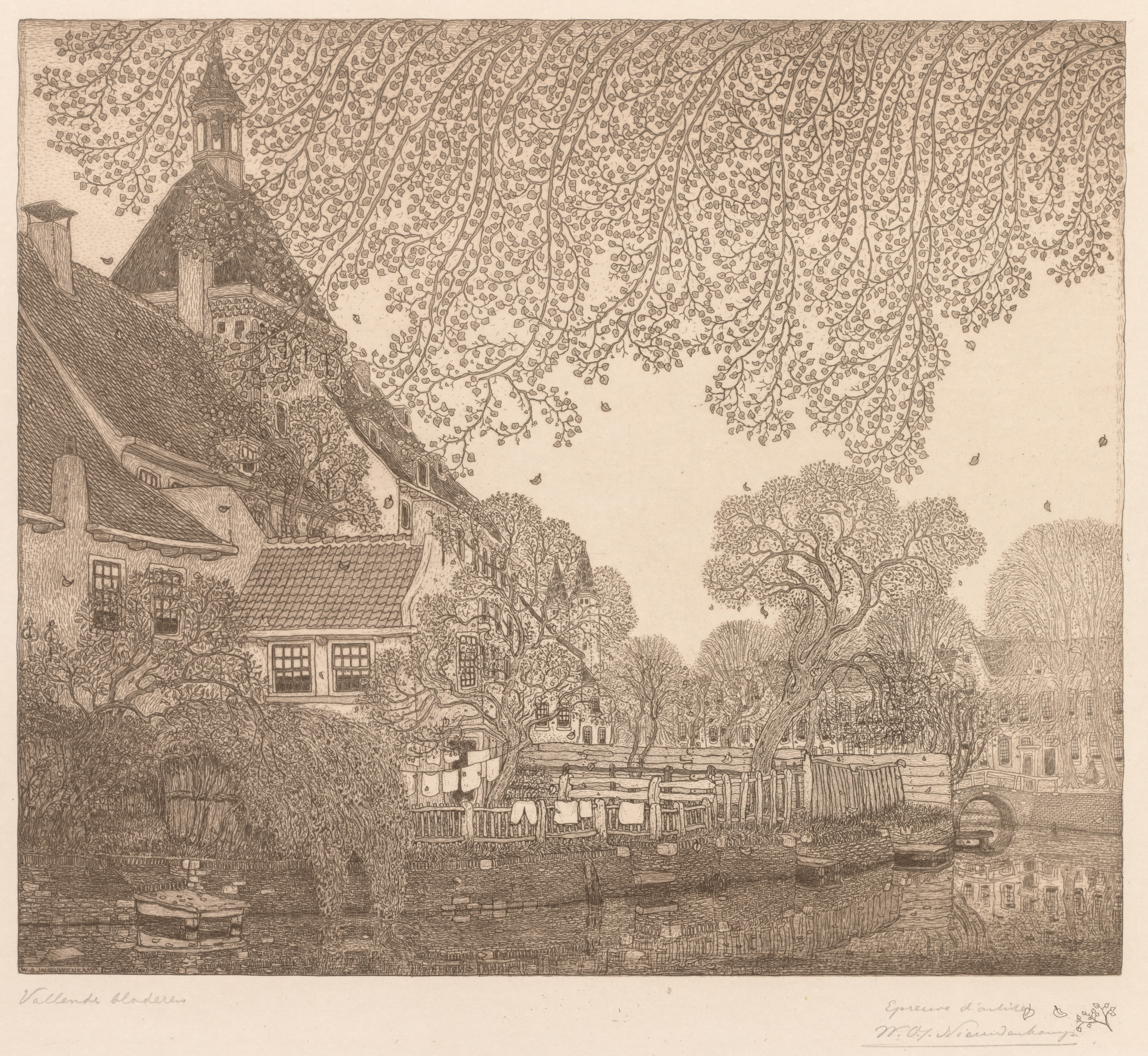 Sepia-toned drawing of a canal scene. A low wall runs along the water's edge, with trees behind. A large tree with long, thin branches hangs over the scene from the top. On the left, several buildings with tiled roofs are visible, with a large tree in front. A wooden bridge crosses the canal on the right. Water is visible in the foreground. The artist's signature and title are written at the bottom.