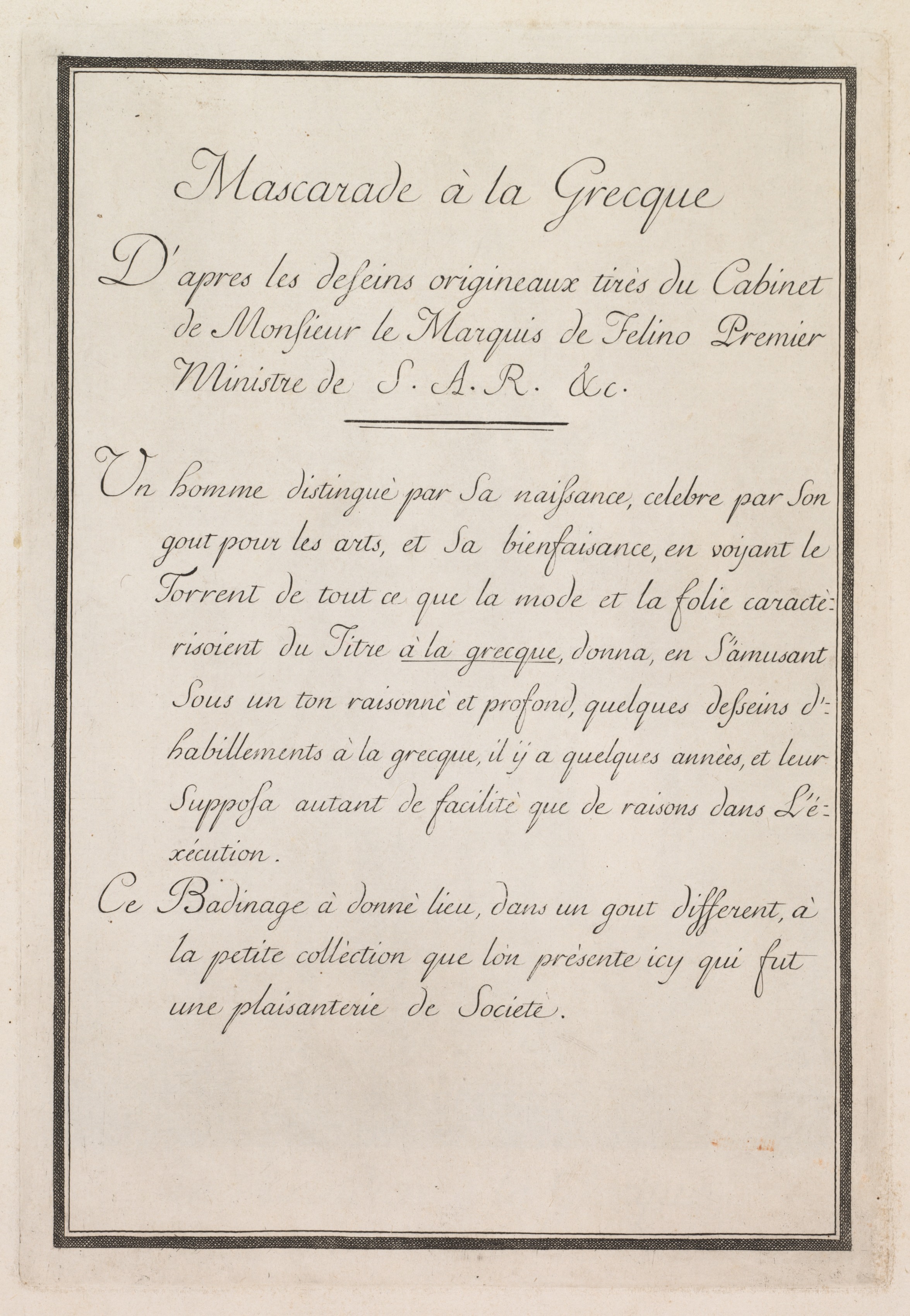 The image shows a page with a black border. The page is beige and rectangular. The border is thin and double-lined. The text is written in black ink and appears to be in French. The text is written in cursive. The text is arranged in paragraphs. The top of the page has a title that reads "Mascarade à la Grecque". The rest of the text is smaller and appears to be a description or introduction. The text is divided into four paragraphs. The background of the page is beige with some darker spots and discoloration. The page appears to be aged or yellowed. The overall appearance suggests an old book or document.