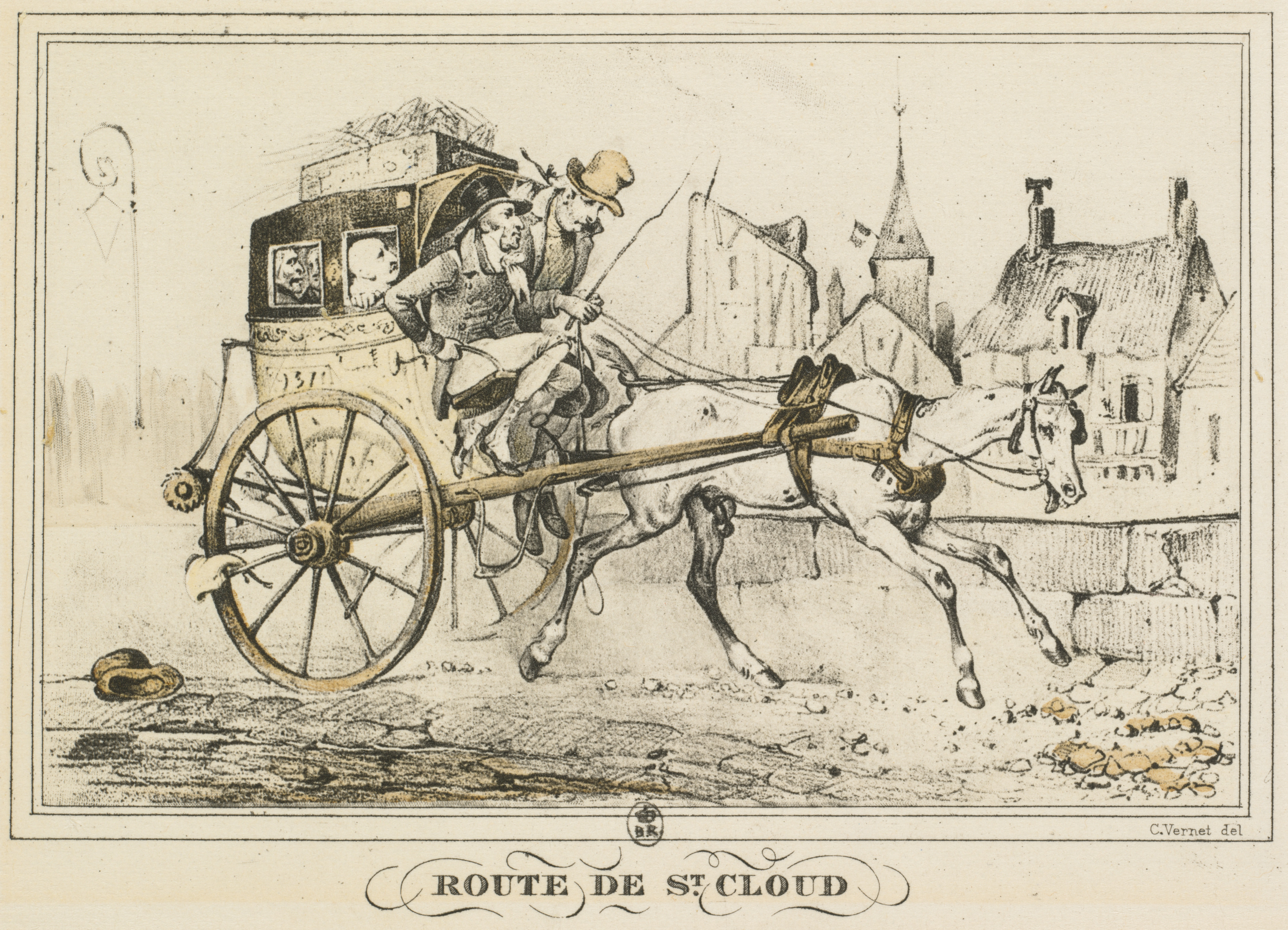 Black and white illustration of a horse-drawn carriage on a road. Two men in old-fashioned clothing are riding. One man holds the reins and whip. The horse is white. A stone wall on the right side and buildings are in the background. A hat is on the ground to the left. Text at the bottom reads "ROUTE DE ST CLOUD."