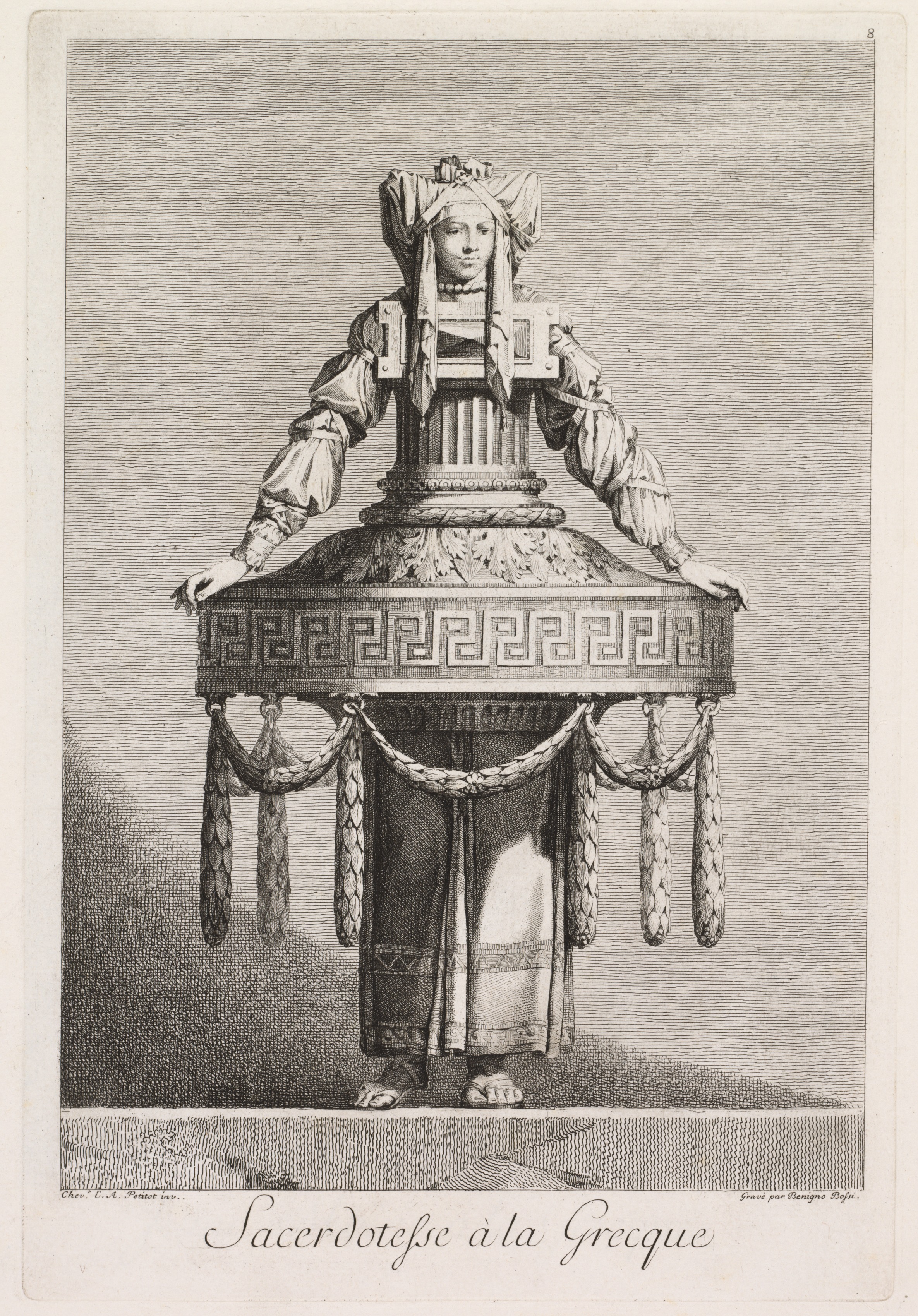 Black and white image of a woman wearing a long dress and head covering. The woman's arms are resting on the edge of a large ornate box that covers her body below the chest. The box has a Greek key pattern around the top. There are tassels hanging from the bottom of the box. She is standing on a base and there is a caption at the bottom.