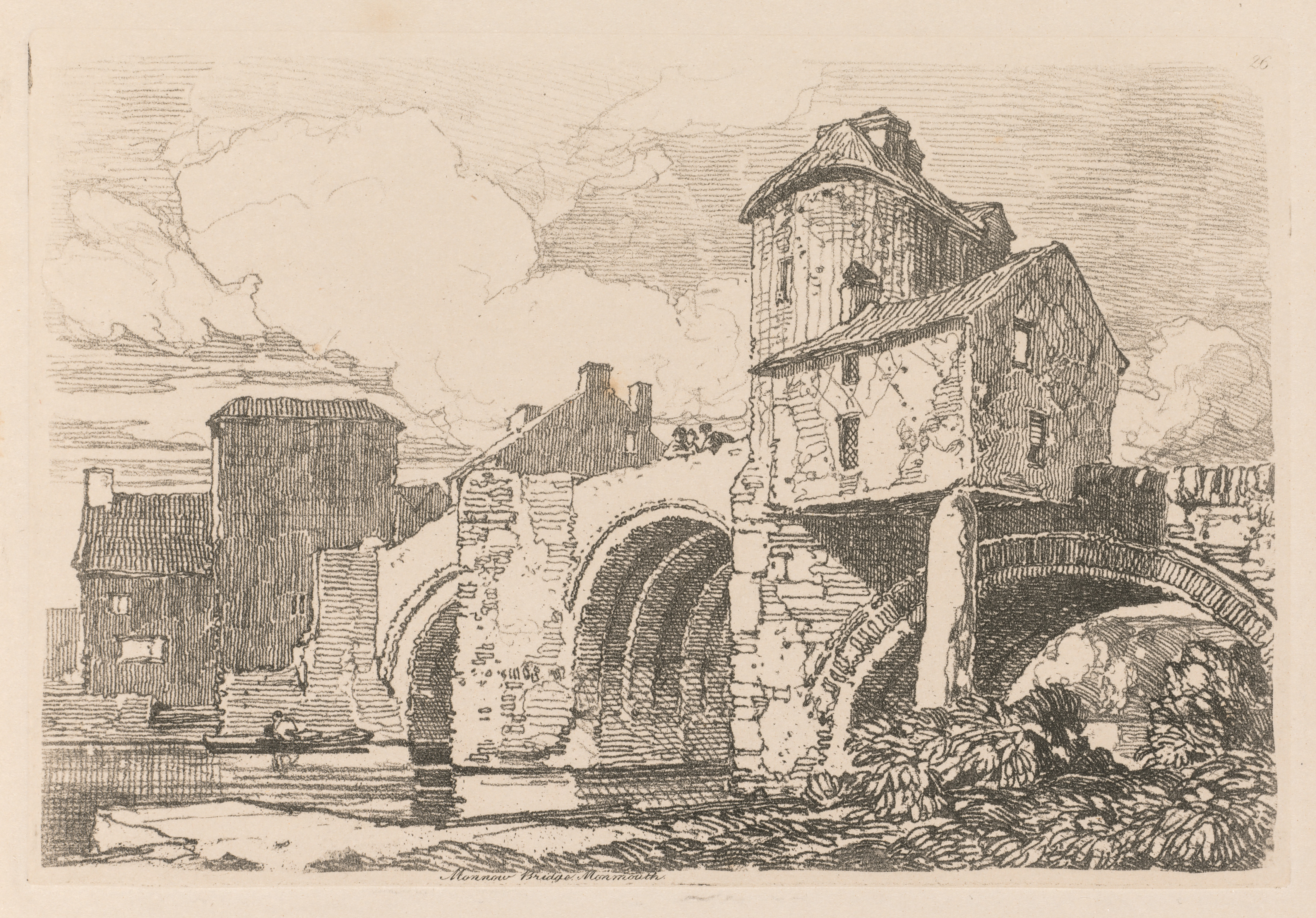 A black and white drawing of a stone bridge with three arches spanning a river. The bridge has a building on top of it to the right. The building is two stories tall with a slanted roof and several windows. There are plants growing at the base of the bridge on the right side. A small boat with a person in it is on the river to the left. There are buildings in the background, and the sky is cloudy. The drawing is on a beige background.
