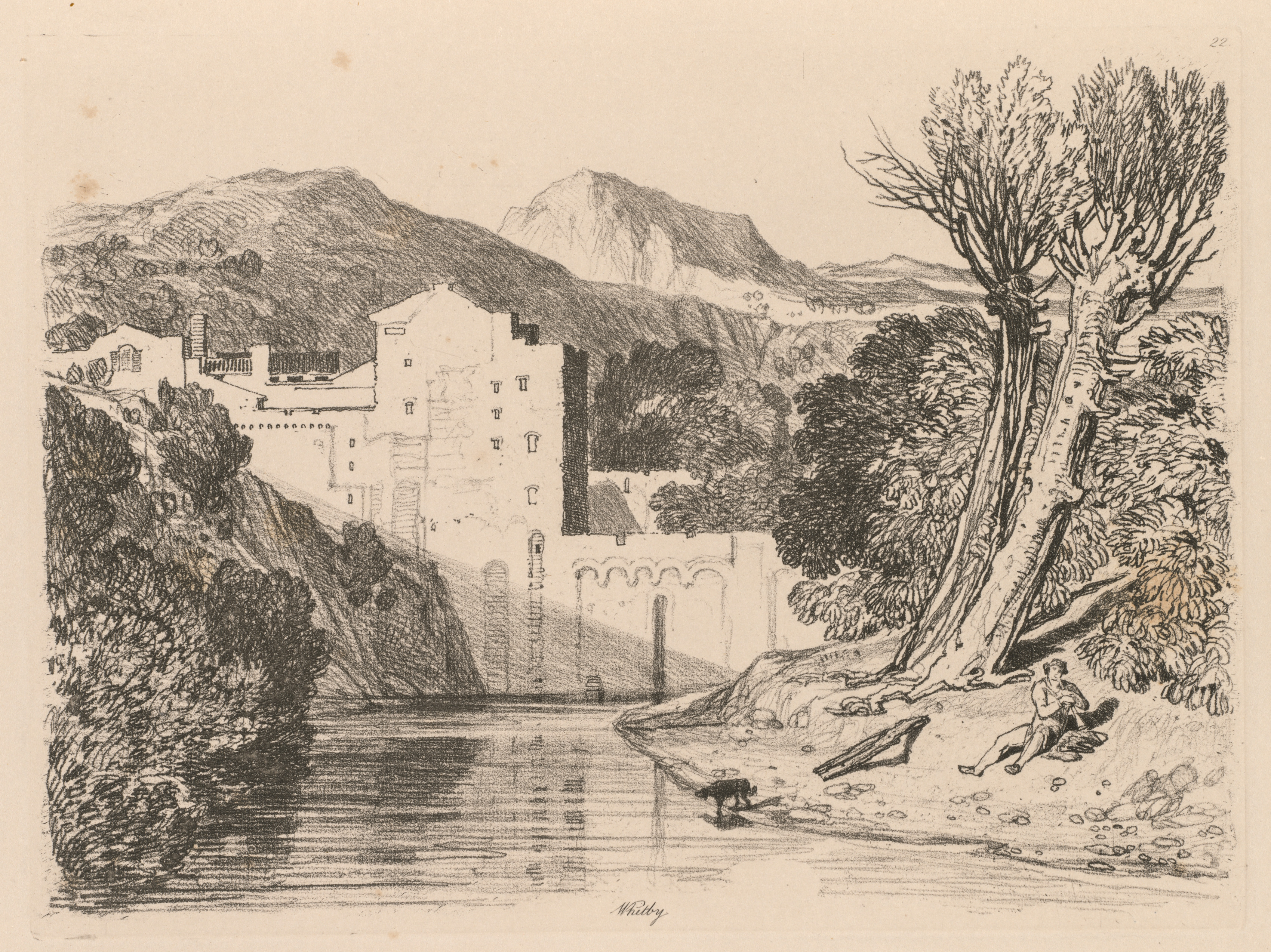 A black and white drawing of a river with a large white building on the left bank and an embankment on the right. The riverbank on the right has a large tree with a man sitting at the base on the right and a dog in the water on the left. There are mountains in the background. The water is dark on the left and lighter on the right, reflecting the sky and surroundings. A hill with trees and bushes rises on the left. The drawing has a sepia-toned background.