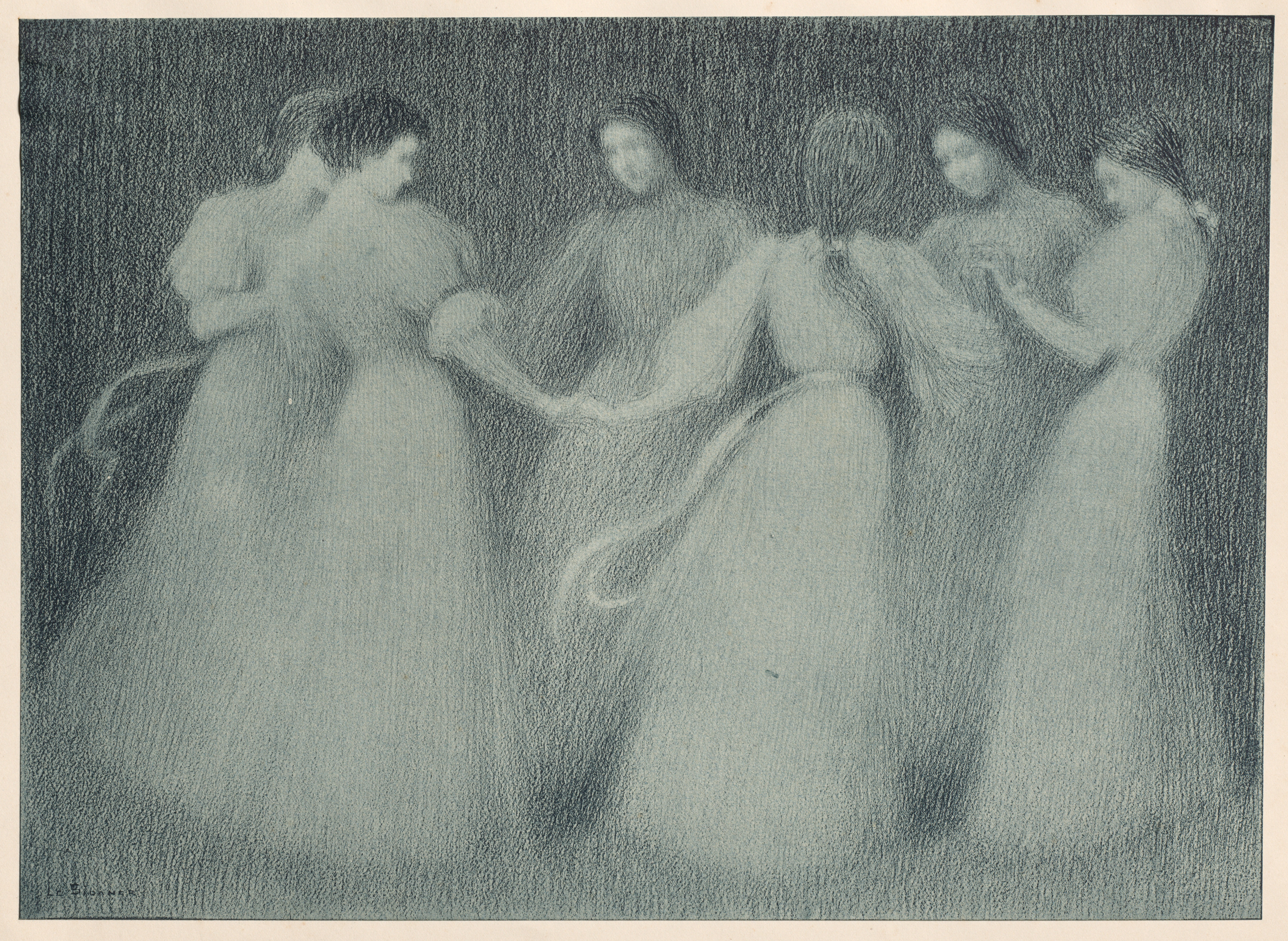 La Ronde by Henri Le Sidaner: A grayscale drawing of five women standing in a circle, hands clasped together, wearing long dresses. The women have dark hair. Their dresses appear to be flowing and are light-colored. The background is dark. The drawing has a textured appearance.