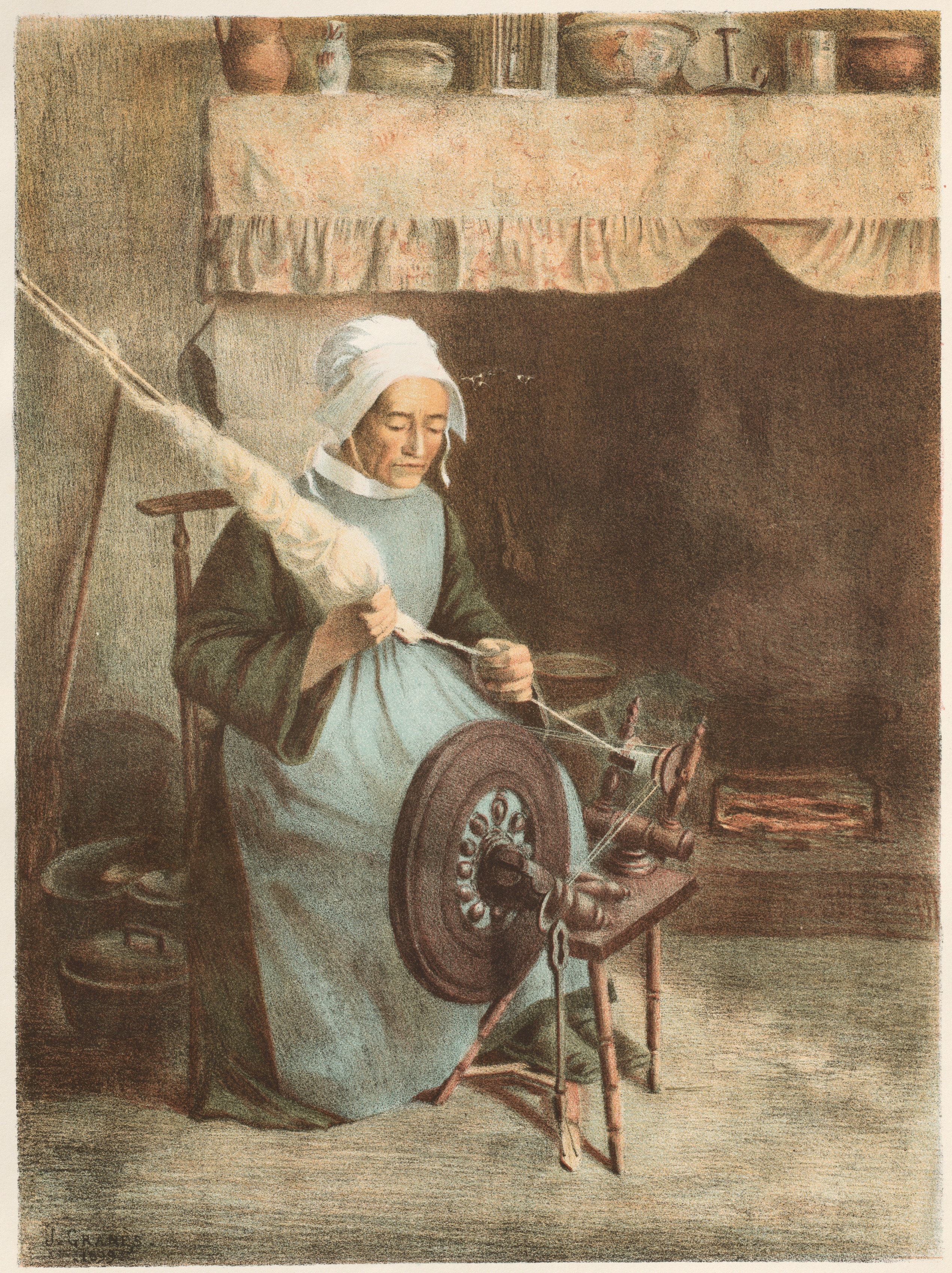 "L'Aïeule" by Jeanne Granès. An older woman wearing a white head covering sits on a chair at a spinning wheel. She wears a long blue dress over a green garment. The spinning wheel is made of dark wood and has a large wheel on the side. The woman's hands are on the spindle and she looks down. A large fireplace with a mantle is in the background. The mantle holds various household items. The wall behind the fireplace is dark. A shelf or ledge on the wall holds more household items. A large wooden spoon leans against the wall on the left. The floor is light-colored. The image has a sepia tone.