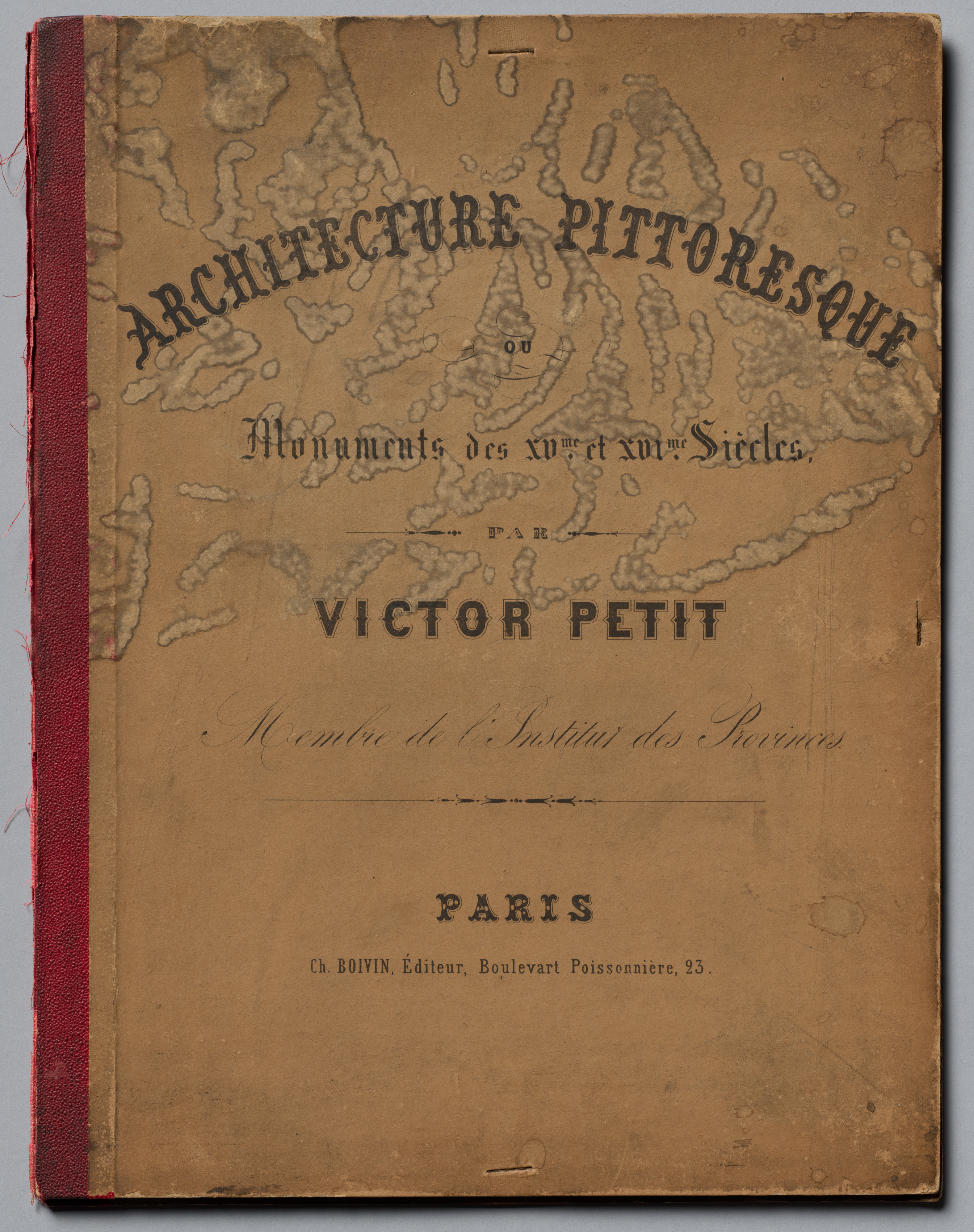 Brown book cover with darker brown text. The top of the cover has "Architecture Pittoresque" in large, black, gothic font. Below that are two lines of smaller text that read, "Monuments des XVème et XVIème Siècles." A horizontal line separates the text below. The next line reads, "Par," then another horizontal line. The next line reads, "Victor Petit." The next line of text reads, "Membre de l'Institut des Provinces," written in cursive. Another horizontal line follows. The bottom of the cover reads, "Paris," then, on the next line: "Ch. Boivin, Éditeur, Boulevard Poissonnière, 23." A red spine on the left. The cover appears to have a marble pattern on it.