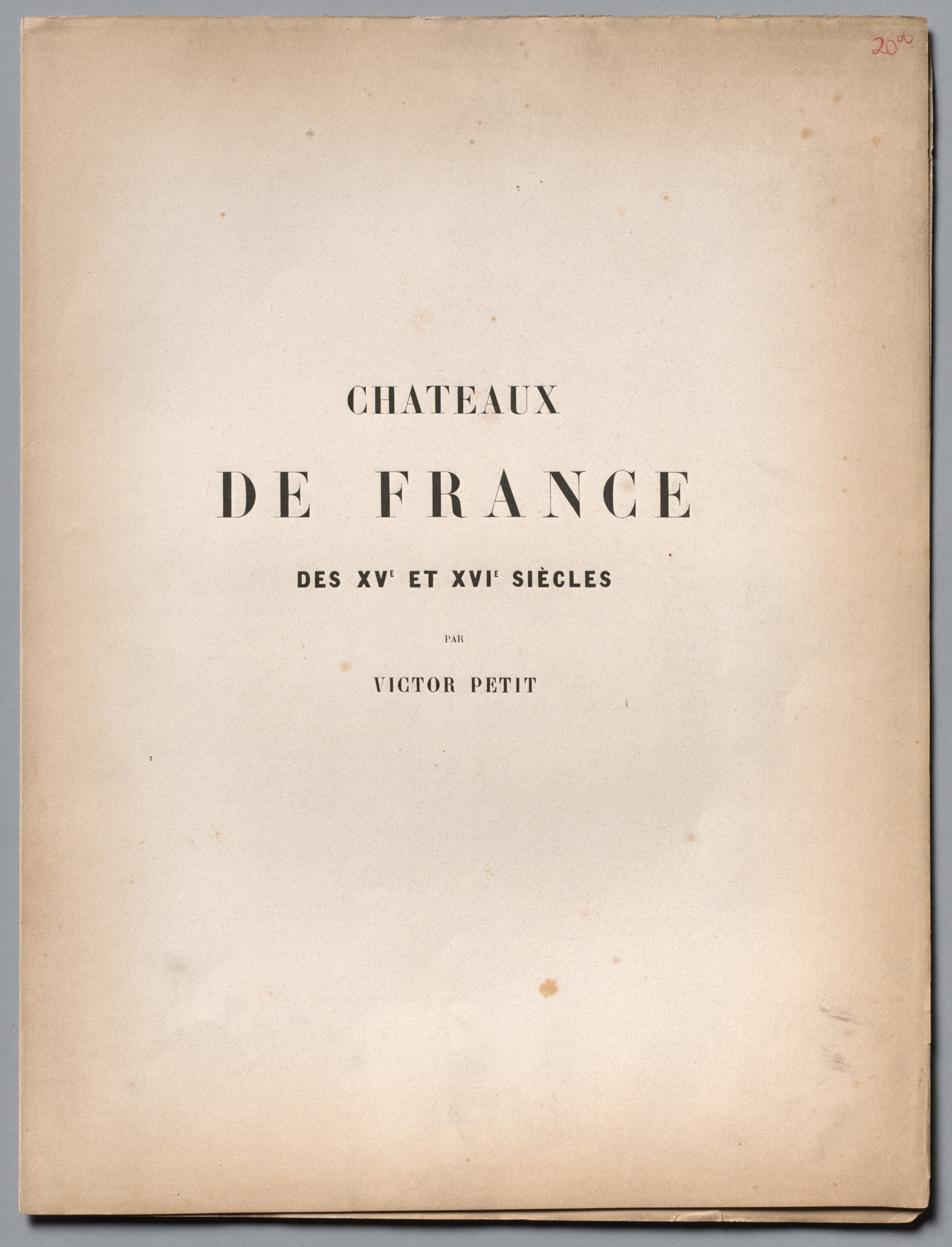 The image shows a beige book cover with brown spots and discoloration around the edges. The cover has black text that reads "CHATEAUX DE FRANCE" in large letters. Below that, in smaller letters, it says "DES XV' ET XVI' SIELES". Further down, in even smaller letters, it says "PAR VICTOR PETIT". The background of the image is gray. There is a small red handwritten number "20" in the top right corner. The cover appears to be old and worn, with visible signs of aging. The text on the cover is in French. The author's name is Victor Petit. The title of the book is "Chateaux De France".