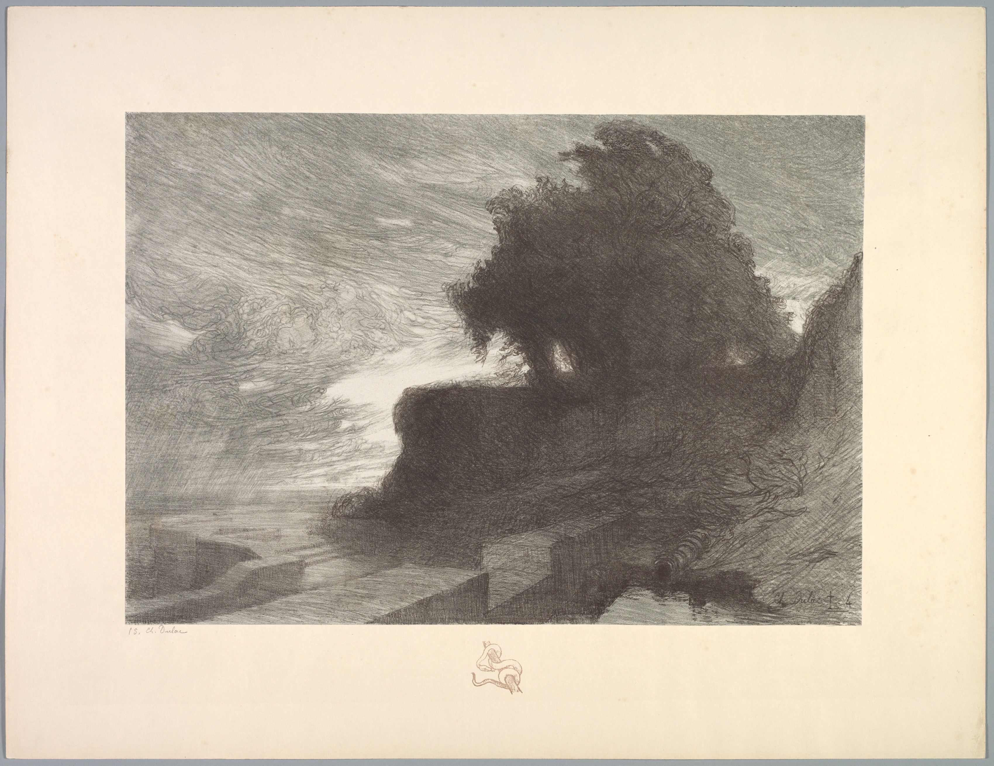 The image depicts a landscape with a large tree on a cliff. The tree is positioned on the right side of the image and appears to be leaning to the left. A small snake-like object is curled on the bottom edge. The cliff has a flat top and drops off sharply on the left side, with a body of water below. The sky above is filled with thick, swirling clouds. The entire scene is rendered in shades of gray. The artwork features a beige border around the image, with a small signature at the bottom center.