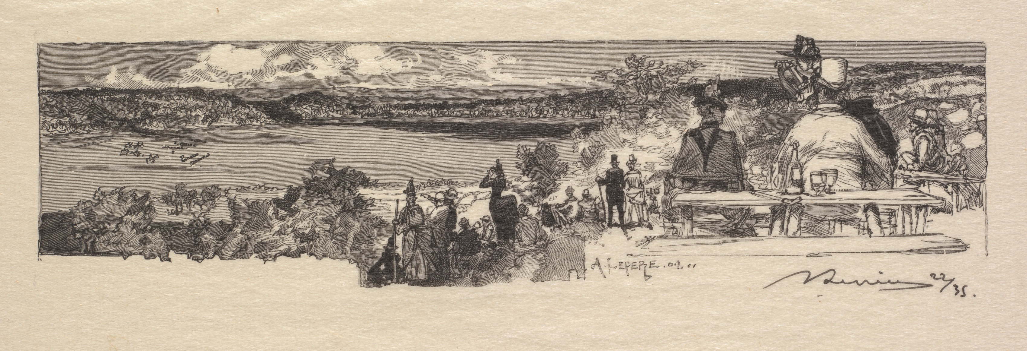 Black and white drawing on tan paper. A landscape scene with a valley and trees in the background. A group of people dressed in old-fashioned clothing are gathered on a hill overlooking a valley. The people are standing and sitting on the right side. The people are wearing hats, coats, and dresses. A man on the right wears a top hat. Tables are in front of the people. A signature appears in the bottom right corner. Another signature appears near the center bottom.