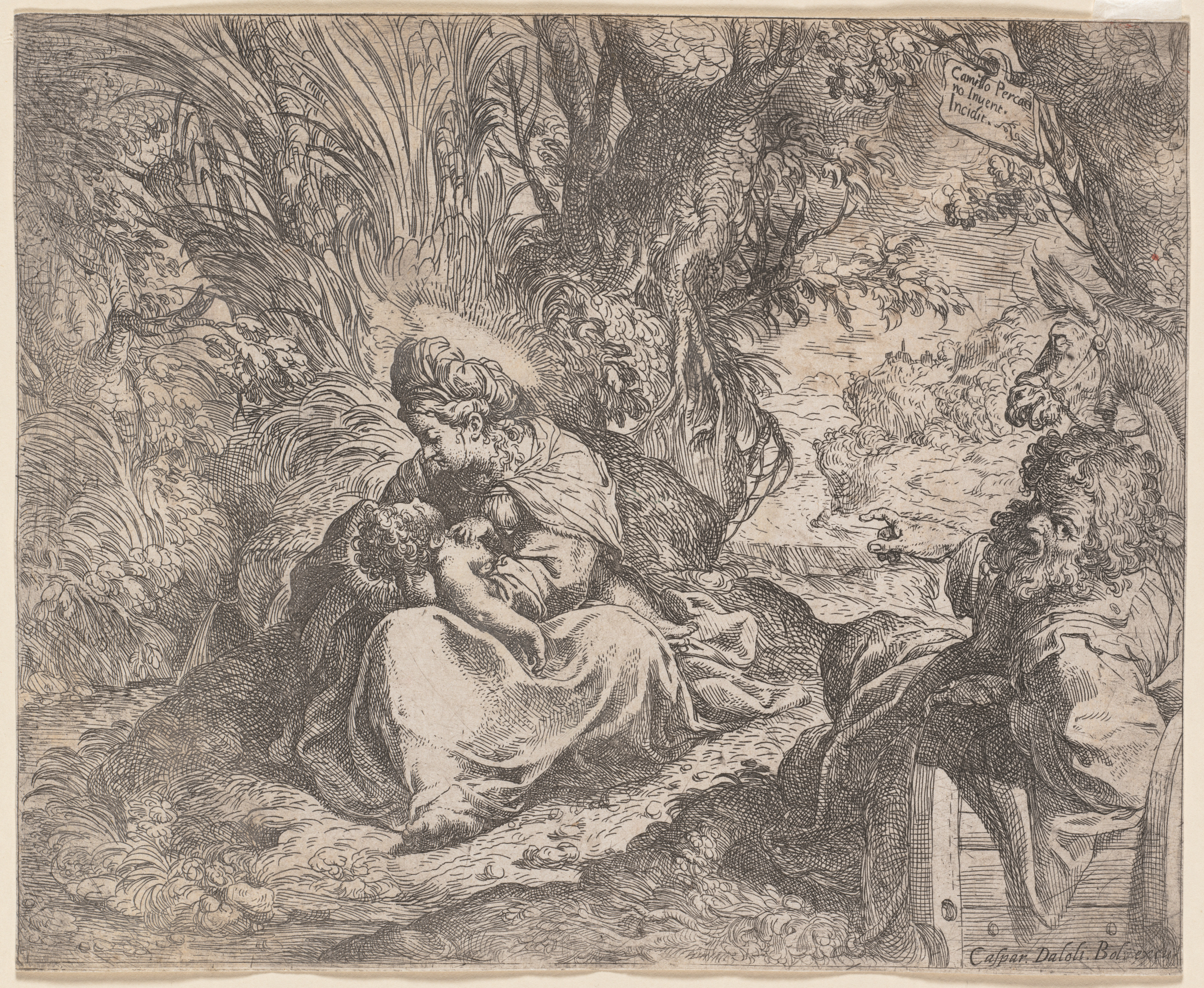 The Rest on the Flight into Egypt by Camillo Procaccini: A black-and-white drawing of a woman sitting on the ground, wearing a long dress and a head covering, cradling a baby in her lap. She sits under a tree with a man, Joseph, sitting on the right, leaning on a staff. A donkey stands behind him. The scene is set amidst dense foliage and vegetation. The drawing is detailed with heavy shading and lines. The woman and child are the central focus. The image has a border around it, with a signature in the bottom-right corner. A landscape with more trees and foliage is in the background.