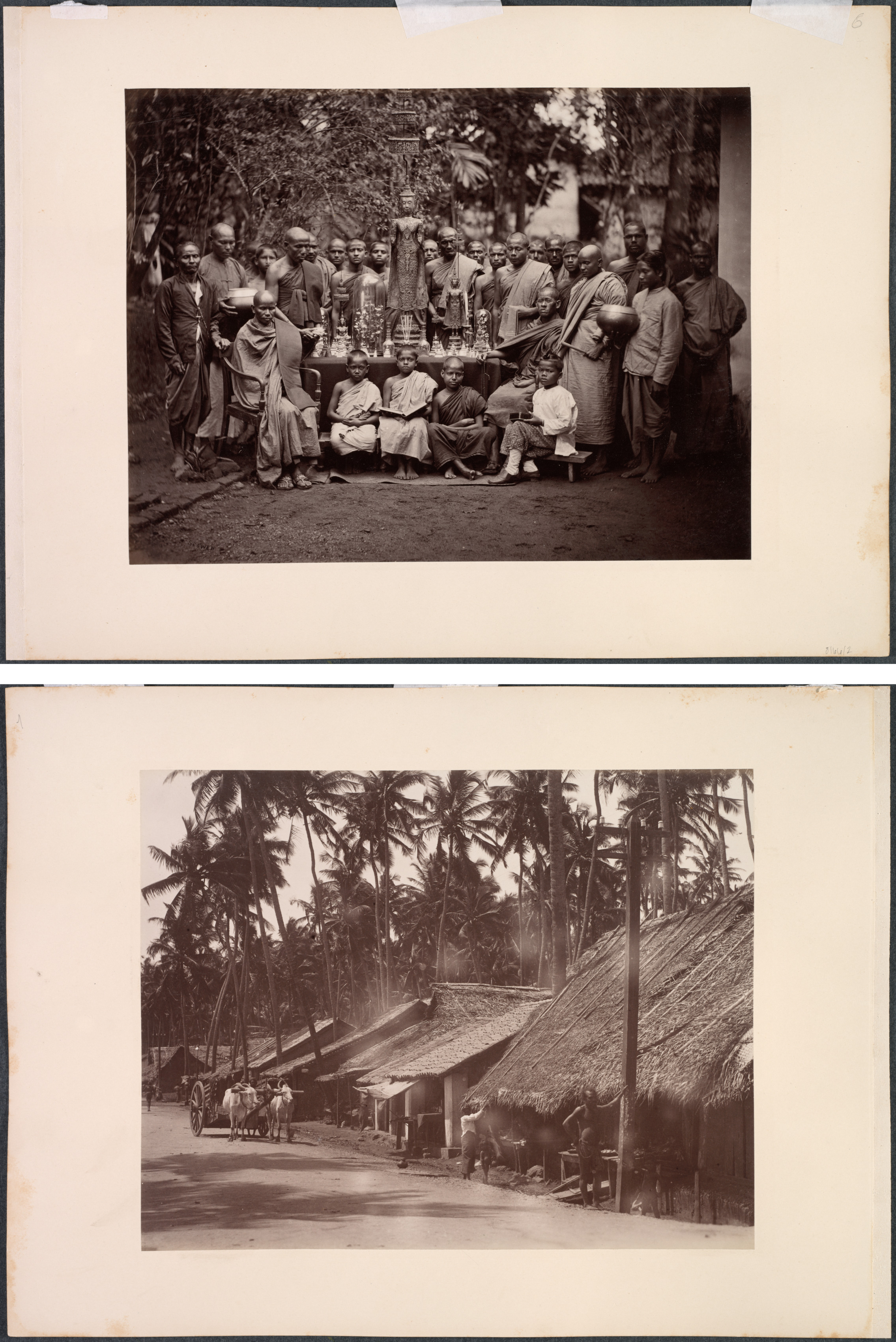 The image is a set of two black and white photographs. The top photograph shows a group of people gathered around a table outdoors. The group consists of men and a child, all dressed in robes. They are standing or sitting around a low table with objects on it. In the background, there are trees. The bottom photograph depicts a street scene with a horse-drawn carriage and a thatched roof building. The building has a sloping roof and appears to be made of wood or other natural materials. There are palm trees in the background. The photographs are mounted on a white background, with a thin black line separating them.