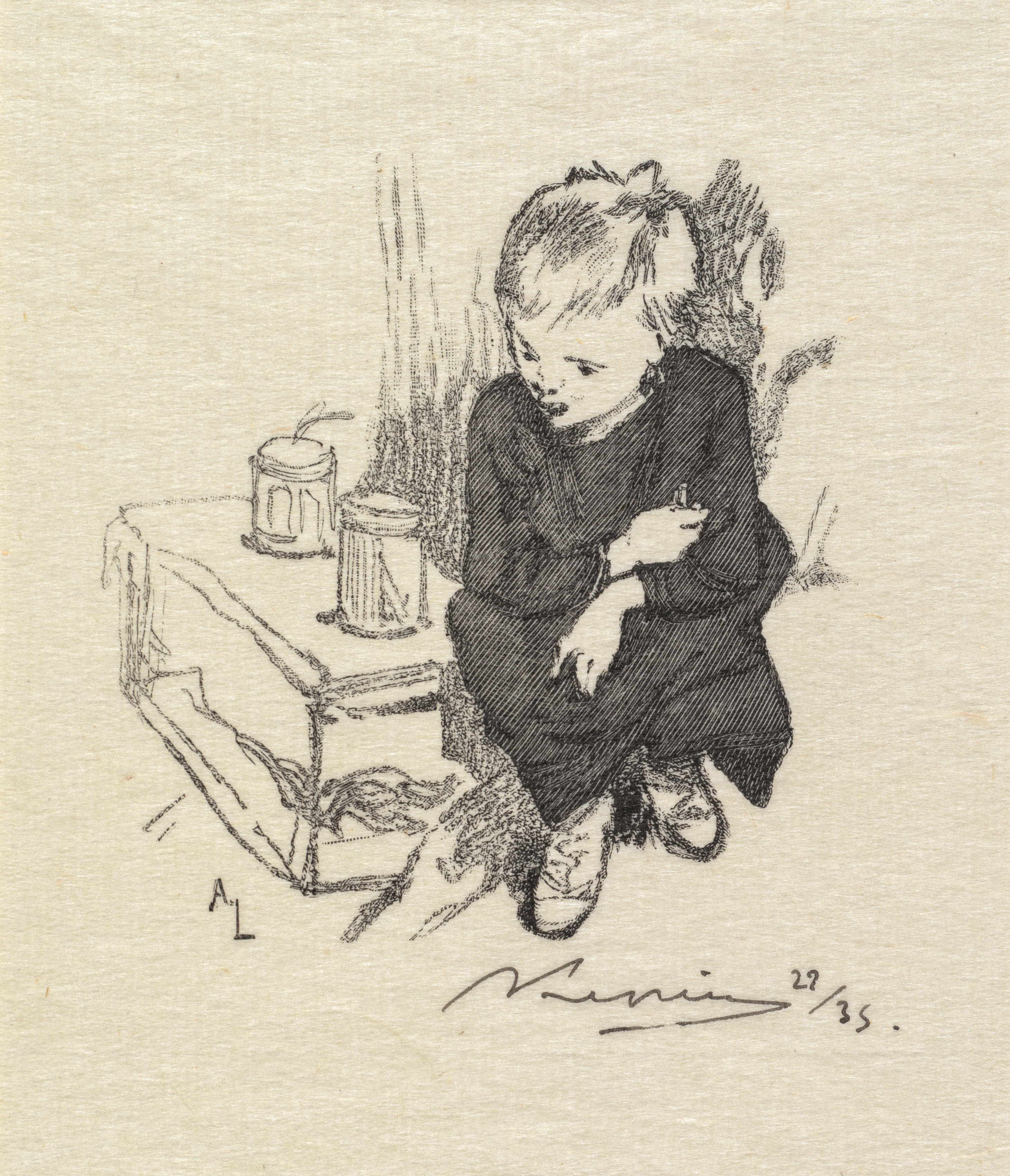 Black and white drawing of a child crouching next to a table; the child wears a dark outfit and white shoes; the child looks down; two cylindrical objects sit on the table; the background shows vertical lines and an object behind the child; the drawing is on beige paper; the artist's signature is at the bottom.