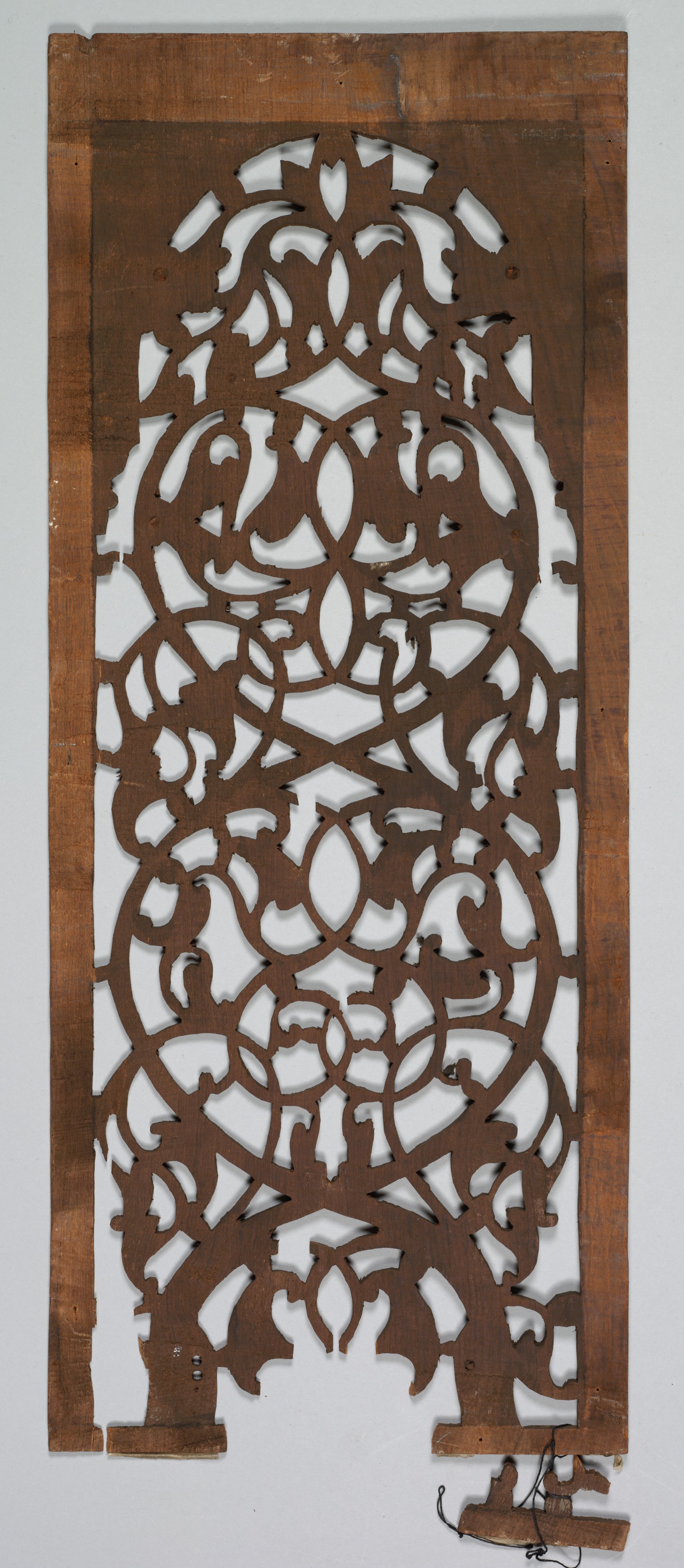 Rectangular brown wooden panel with darker edges. The panel features an intricate design cut out of its center, consisting of interconnected curved lines and shapes. The cut-out design includes rounded symmetrical elements throughout. Three pieces of wood are broken off at the bottom; two are flat and one has a curved top. Black wires are attached to the broken pieces. The background behind the panel is light gray. The panel by artist is titled "Carved Wood Panel".