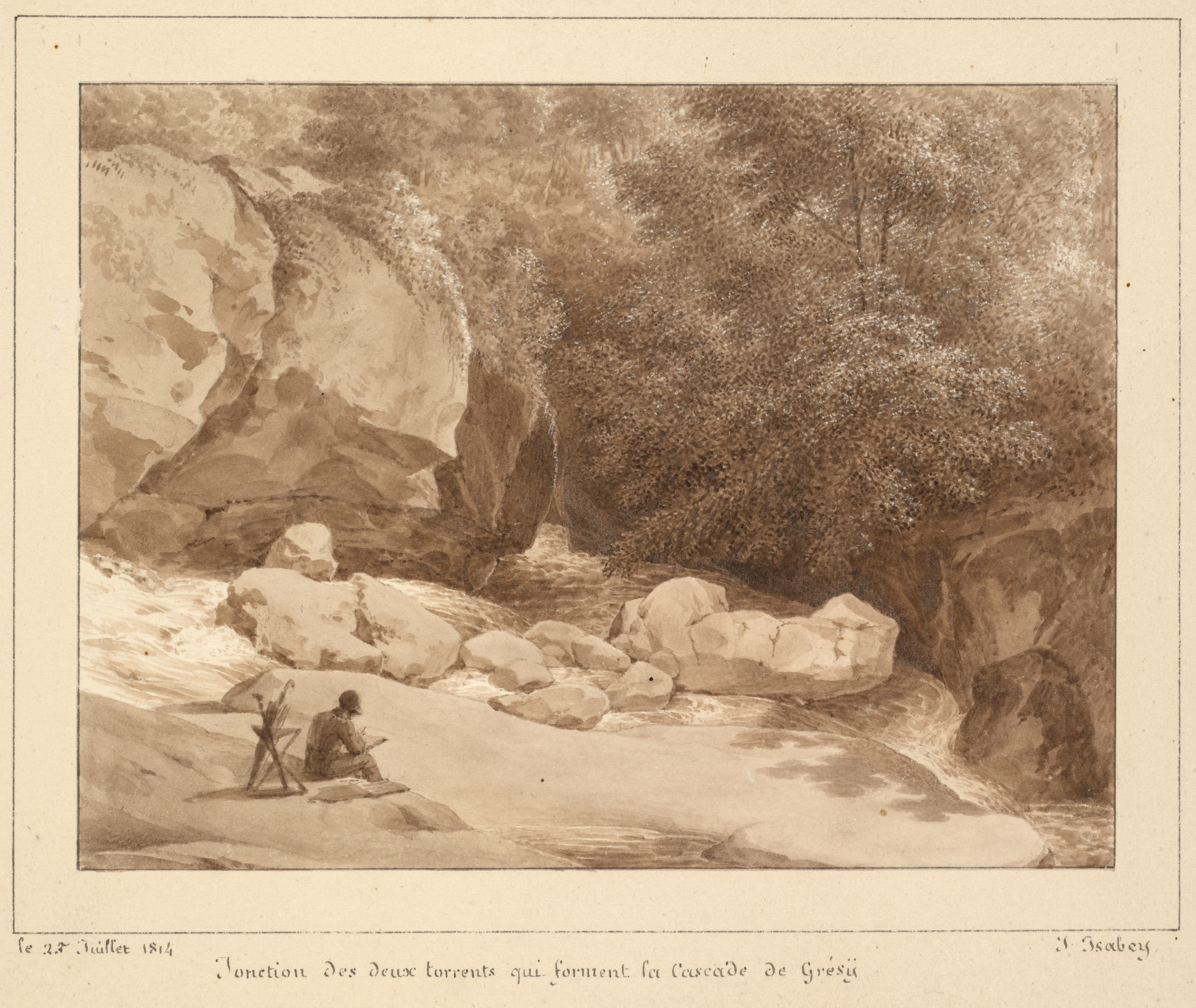 Sepia-toned drawing of a rocky landscape with a stream. A man sits on the left side, on a rock, with his back to the viewer, and an easel beside him. Large boulders line the stream. Steep cliff face on the left, with trees on the right. A dense thicket of trees on the right side. The artwork is signed and dated in the bottom corners. A caption runs along the bottom.