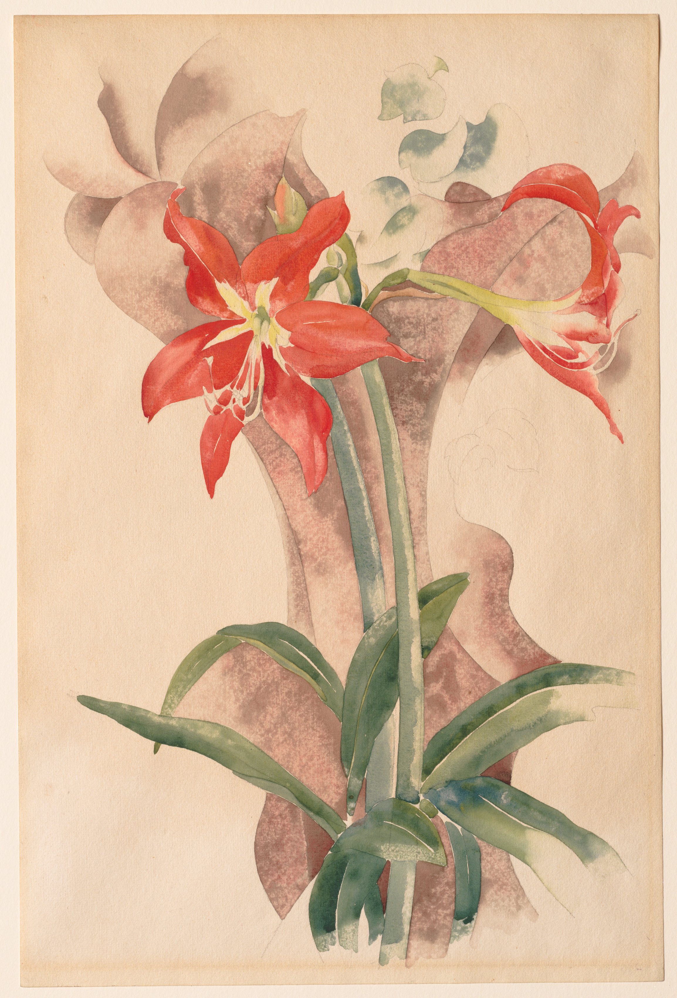 Red flowers with yellow stamens and green leaves on a beige background. Two flowers; one to the left and one to the right. The flower on the left faces forward and the flower on the right faces right. The flowers each have six petals. Long, thin green stem. Multiple green leaves protruding from bottom of stem. Background contains darker beige abstract shapes. Artist: Charles Demuth. Title: Amaryllis.