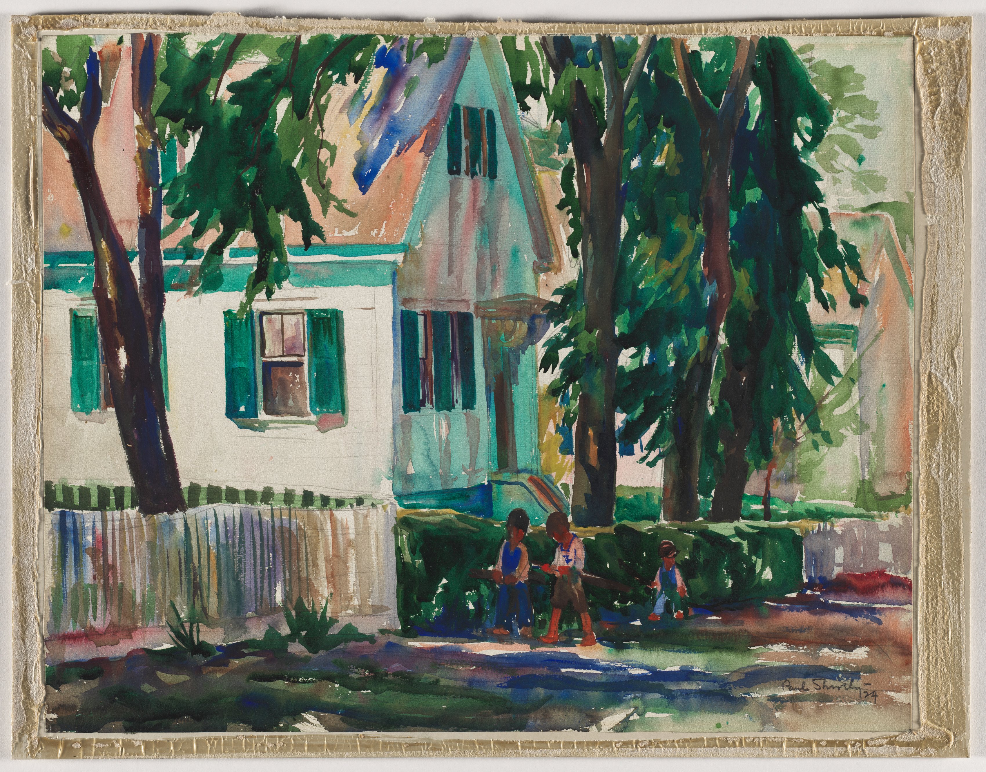 High Noon by Paul Shively, depicts a house with a white and teal exterior with green shutters and a picket fence along the front. The house has two stories and a steeply pitched roof. A large tree stands on the left side and three trees are on the right. Three children are standing on the sidewalk in the foreground. The edge of the painting is rough and tan.