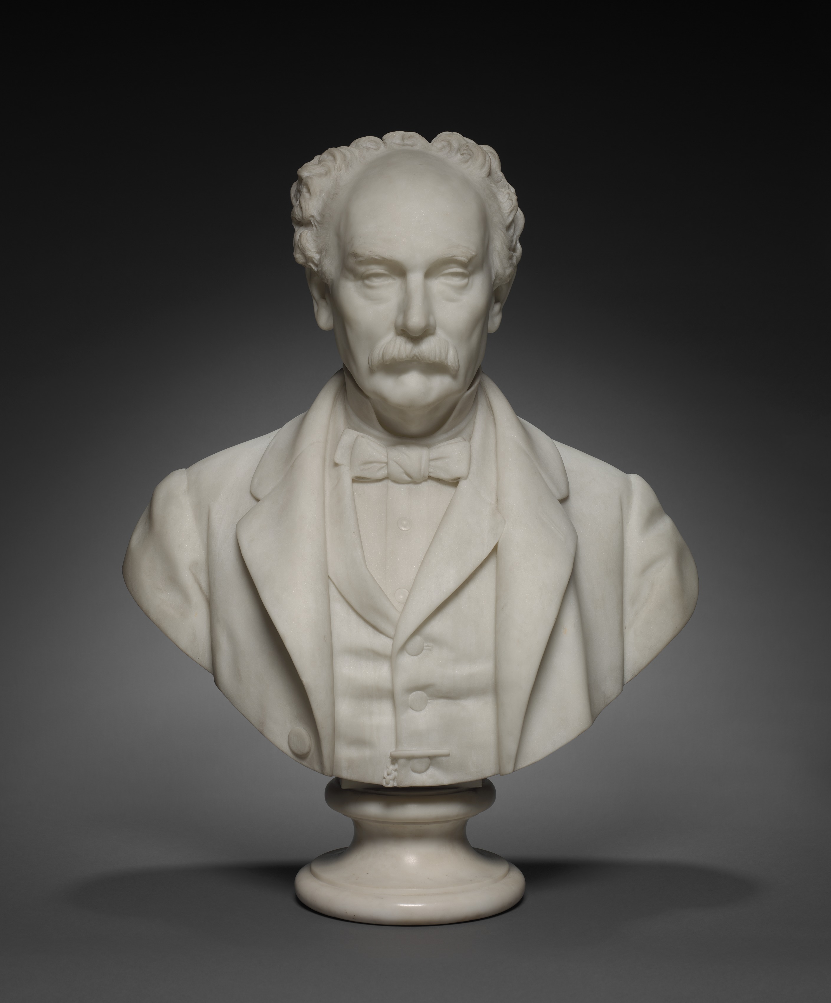 White marble bust of a man. The man has short curly hair. He wears a suit jacket, vest, and bow tie. The bust shows the man from the waist up. The bust sits on a short pedestal. The background is dark gray, fading to black at the top.