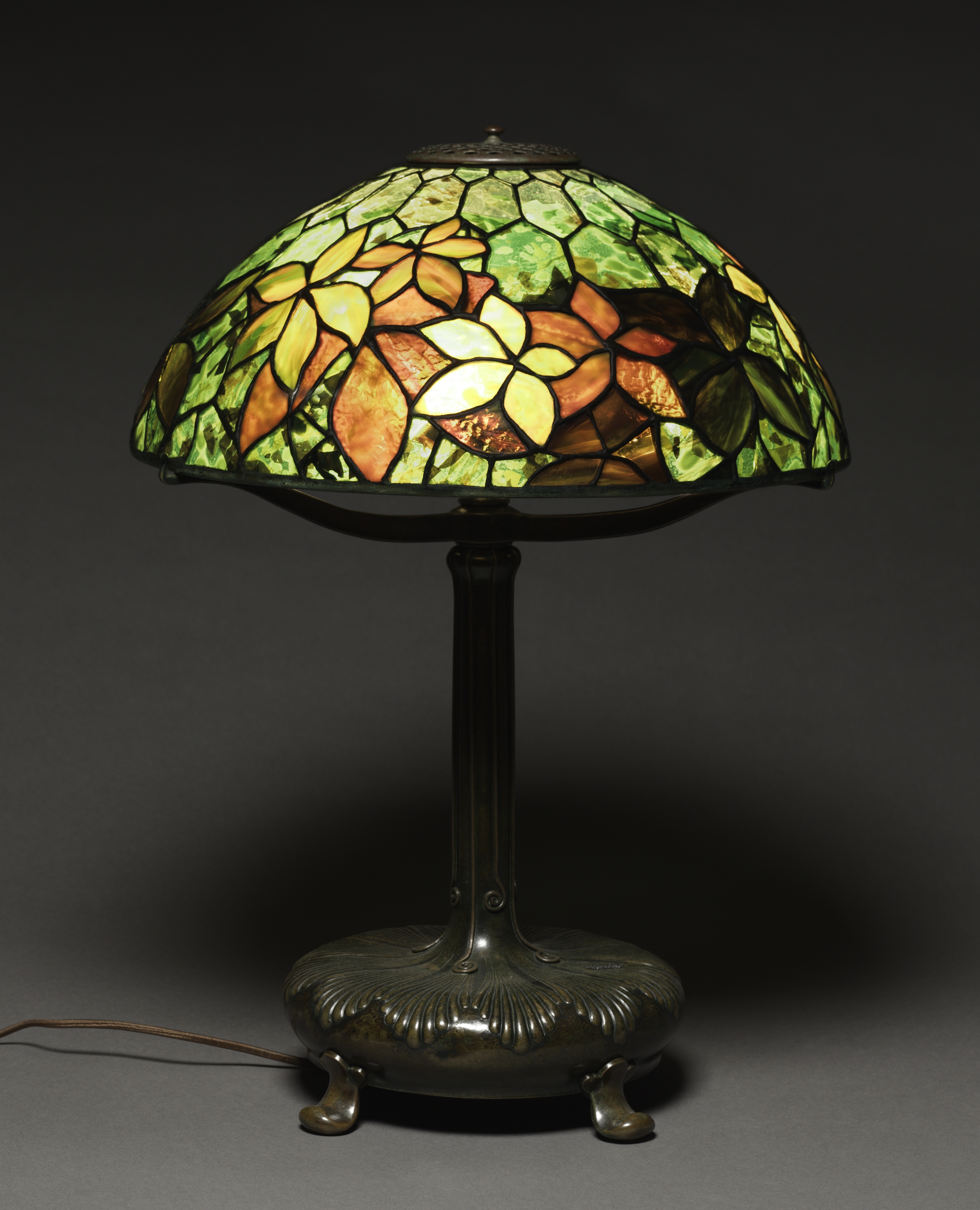 The lamp has a bronze base with a fluted column and three feet. The base is round and has a decorative edge. A power cord extends from the back of the base. The lampshade is made of stained glass in shades of green, yellow, orange, and white. The glass pieces are arranged in a mosaic pattern with black lines separating them. They form a design of flowers and leaves. The shade is dome-shaped and has a small knob on top. The background is dark gray.