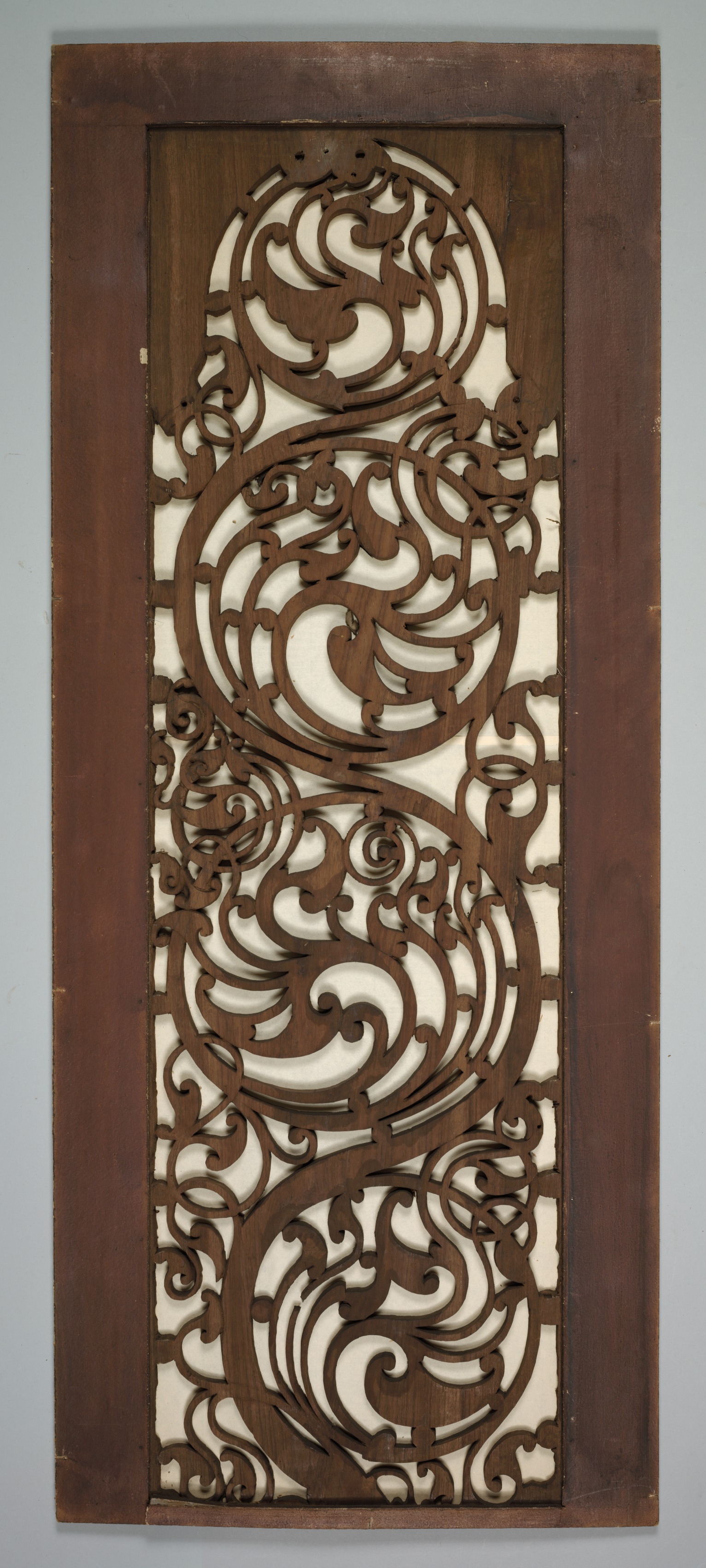 The image shows a rectangular wooden panel with a carved design. The panel is long and narrow, with a thick border around the edge. The border is dark brown wood. Inside the border, there is a large, intricate design carved into the wood. The design features swirling patterns that resemble waves or flowers. The carved areas are the same dark brown color as the border. The background of the panel, visible through the carved areas, is white. The panel appears to be hanging on a plain gray wall. The title of the piece is "Carved Wood Panel". The image does not provide information on the artist.