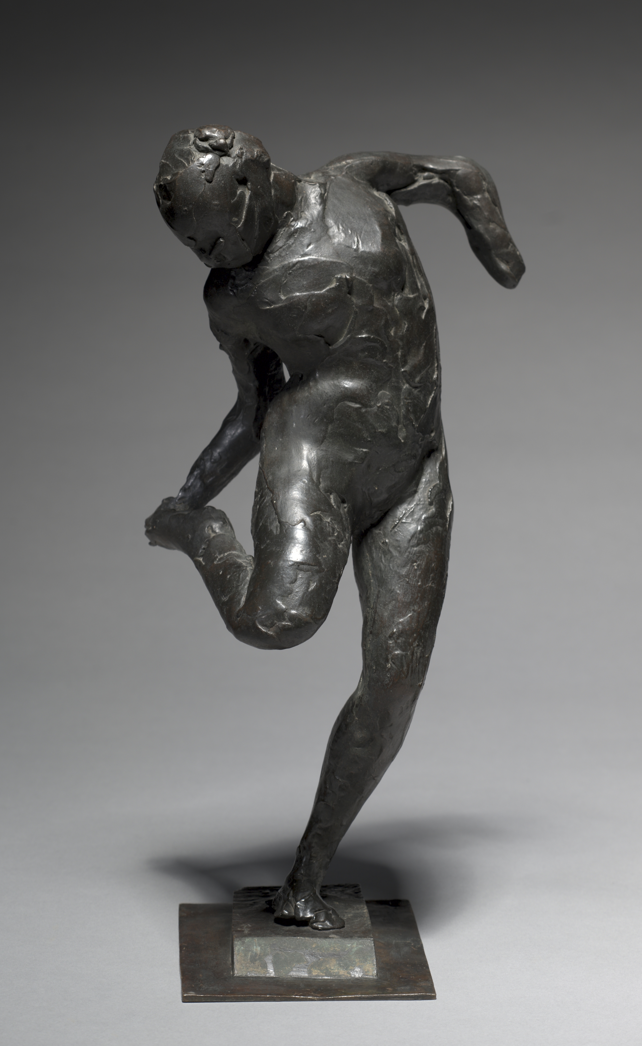 A sculpture of a dancer, specifically a female dancer, looking down at the sole of her right foot. The dancer is depicted barefoot and nearly nude. She stands on her right leg, with her left leg bent behind her and her left arm extended behind her. Her head is tilted down. The sculpture is made of dark-colored material, likely bronze, and has a rough texture. The base of the sculpture is a square metal plate. The background of the image is a gradient of gray.