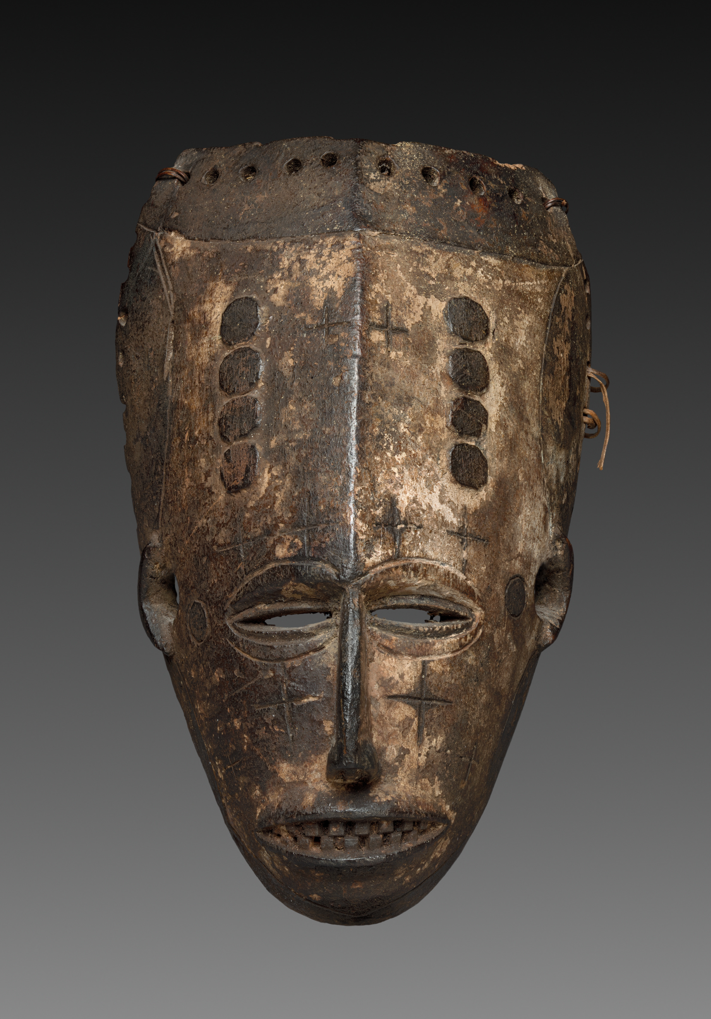 Wooden mask, Face Mask (Agboho mmuo), by Igbo artist. Dark brown color with lighter brown and tan patches. Top of mask has several holes around edge. Two rows of 7 holes down sides of face. Face has carved eyes, nose, and mouth. Cross-like marks under eyes and on either side of nose. Metal loops on sides. Background transitions from black at top to gray at bottom.