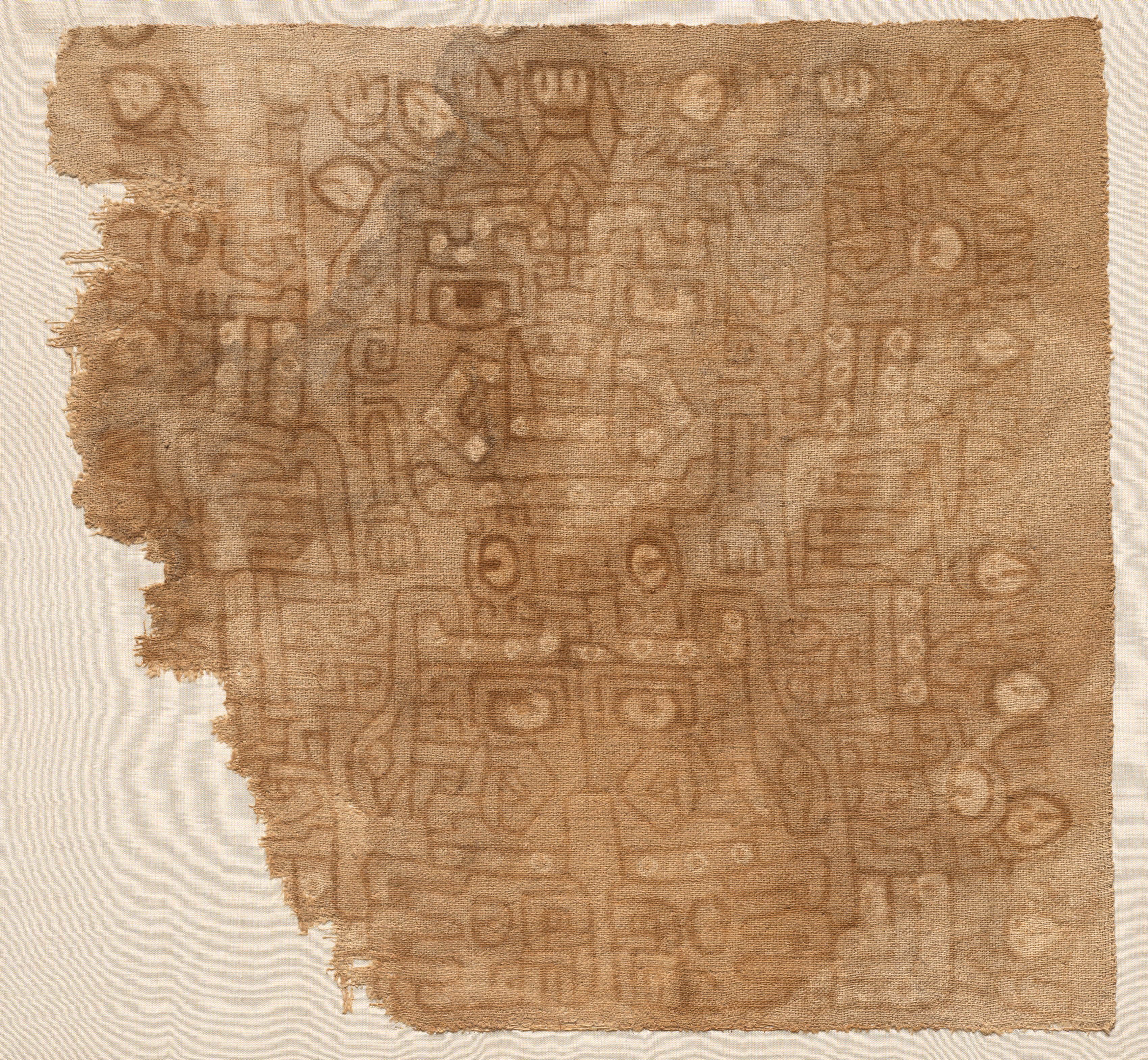The image shows a textile fragment with a design. The fragment is rectangular with rough, frayed edges and a light-brown color. The fabric appears woven with a pattern of various shapes, including squares, circles, and abstract figures. The background of the image is a light beige color, providing contrast to the darker brown of the textile. The textile fragment is titled "Textile Fragment with Cotton Goddess" and is by an unknown artist.