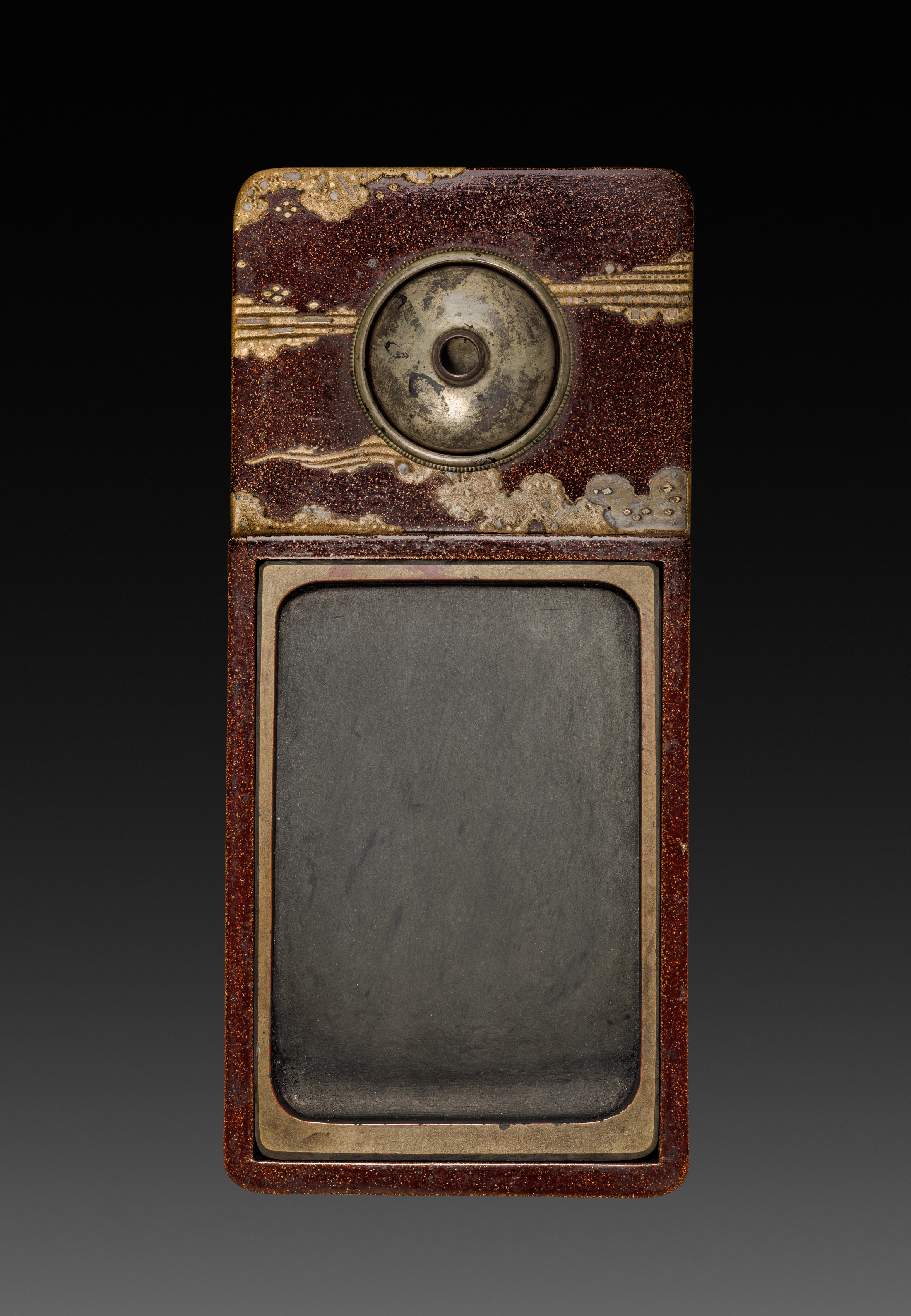 Rectangular box with rounded corners, brown with gold design. A circular indentation with a small hole at its center is on the top. The top of the box features a gold design on a brown background. A large square indentation with a gold border is on the bottom. The box appears to be a writing box, also known as a Suzuribako, and includes an inkstone and water dropper, with the design of a phoenix in Paulownia.