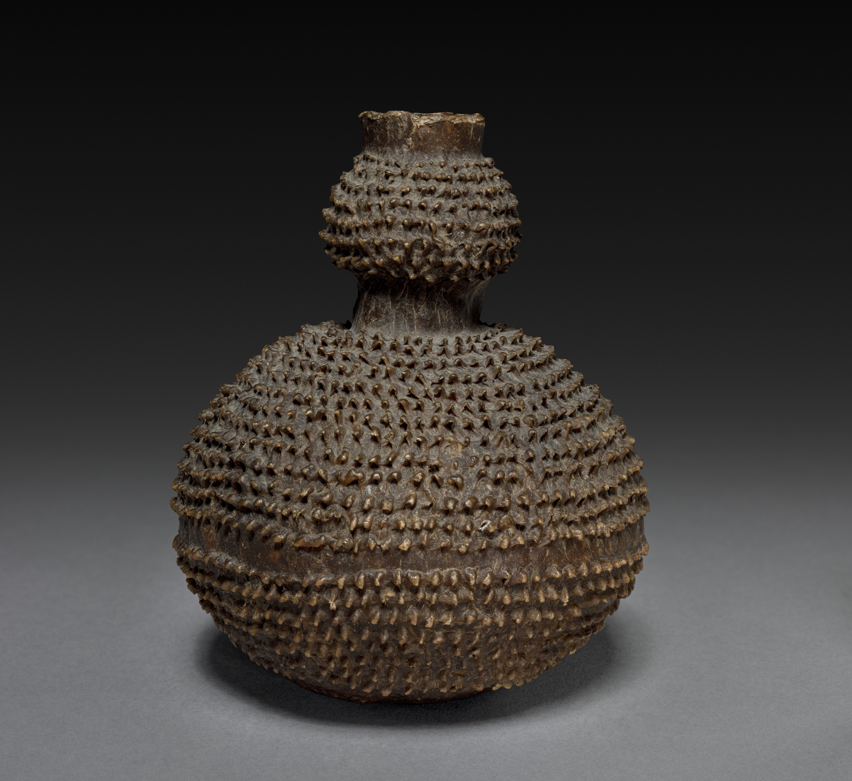 Snuff Container by Unknown Artist. The image shows a dark brown, double-bulbous container with a narrow neck. The container has a textured surface featuring rows of small bumps. The bottom bulb is larger and spherical, while the top bulb is smaller and more cylindrical. The container sits on a gray surface, casting a shadow directly underneath. The background transitions from black at the top to gray at the bottom.