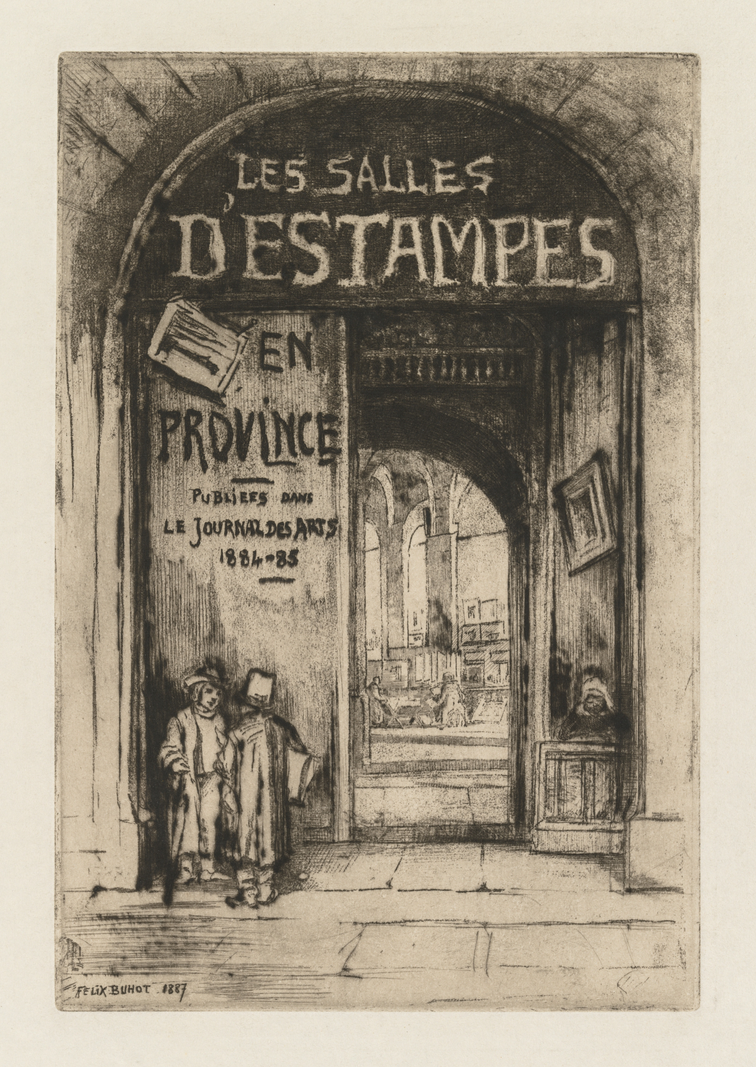 Black and white drawing of a stone archway with a doorway. Two lines of large white text on the archway read "LES SALLES" and "DESTAMPES". A smaller rectangular sign to the left with several lines of text. The doorway has an open wooden door. Two people stand on the left. A picture frame hangs on the right wall.