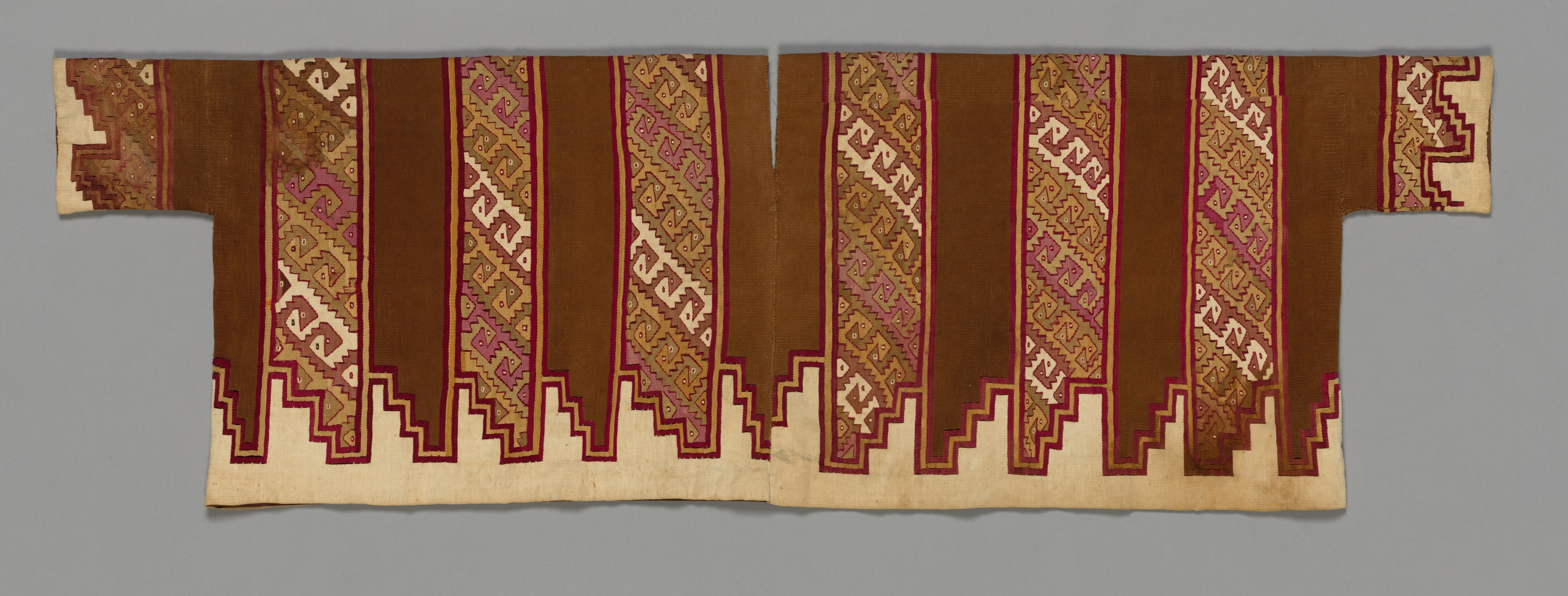 The image depicts a sleeved tunic by the artist not specified. The tunic is made of fabric and has a brown base color. The tunic has short sleeves and a rectangular shape. The bottom hem of the tunic is beige with a zigzag pattern in red. The main body of the tunic features vertical stripes in brown, with decorative panels in between. The decorative panels are gold, white, and pink. The panels have intricate designs and patterns. The tunic is laid flat on a gray background. The image shows the front of the tunic.