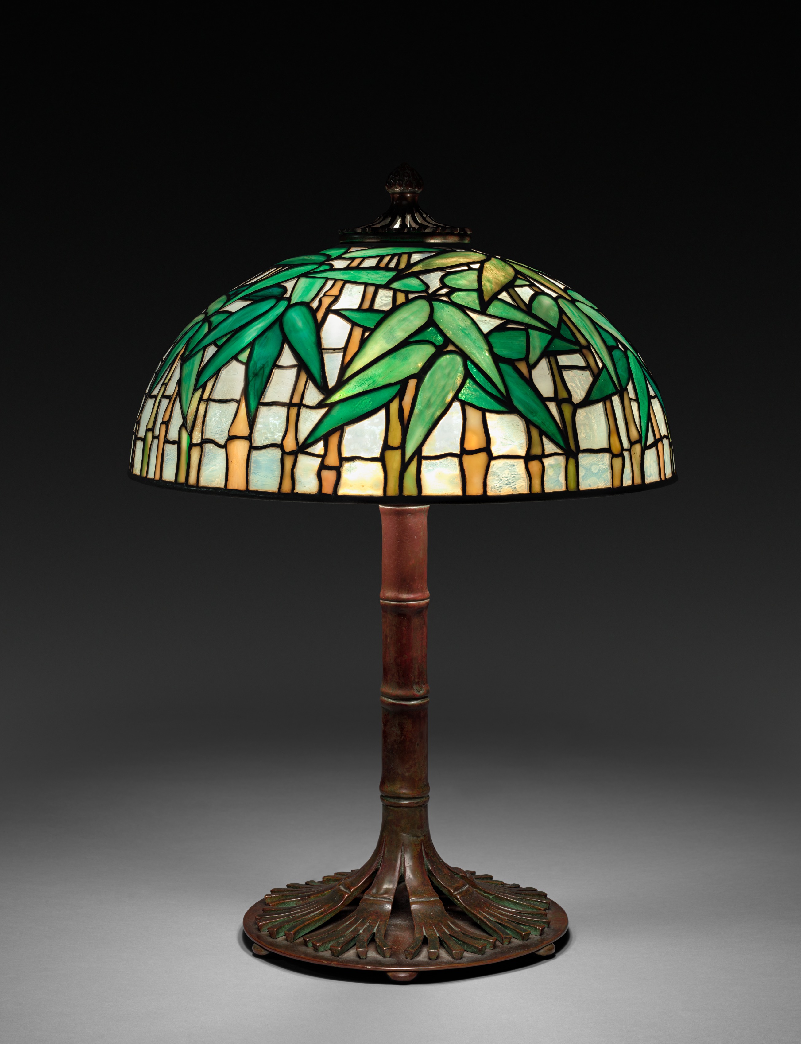 The lamp has a bronze base and stem resembling bamboo. The stem has a cylindrical shape with bamboo-like ridges. The base is round with an etched tree trunk design. The lampshade is a dome shape and made of stained glass in a mosaic pattern. The shade depicts bamboo stalks in shades of green for the leaves, and white, gold, and brown for the stalks. The background is black to dark grey gradient.