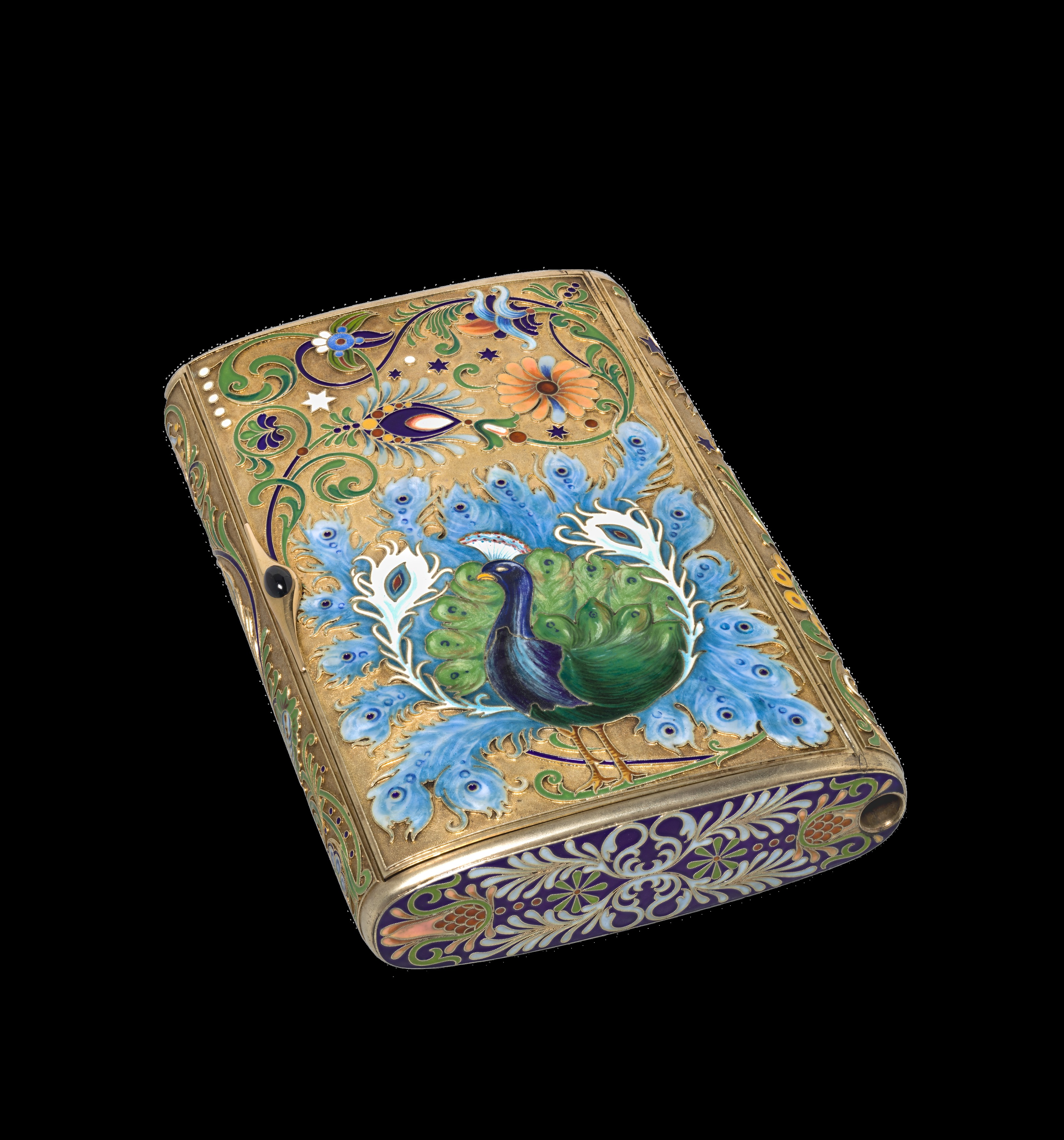 Cigar Box by Feodor Ivanovich Rückert. Rectangular box with rounded corners and edges. The box has a gold-colored background. The lid features a large peacock in shades of blue, green, and purple, surrounded by blue flowers with peacock eyes. The peacock faces left. The box's sides and bottom have a dark blue background with gold, green, and white designs. The bottom and sides have similar ornate patterns. The hinge is on the left side. The box has a small circular indentation on the right side. The box is set against a gray background that is darker at the top and lighter at the bottom.