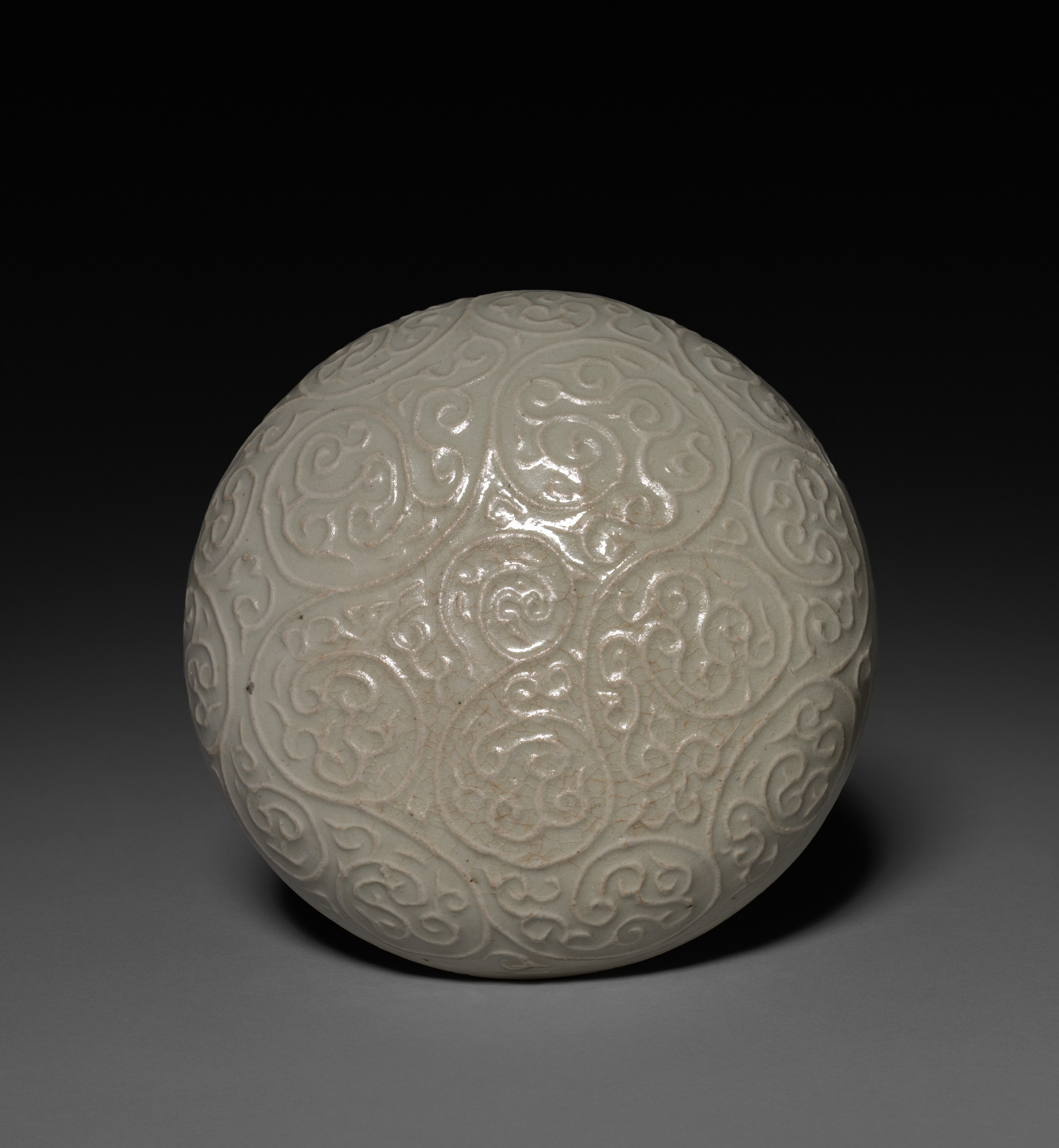 Round Covered Box with Floral Scrolls in Relief: Qingbai type Ware