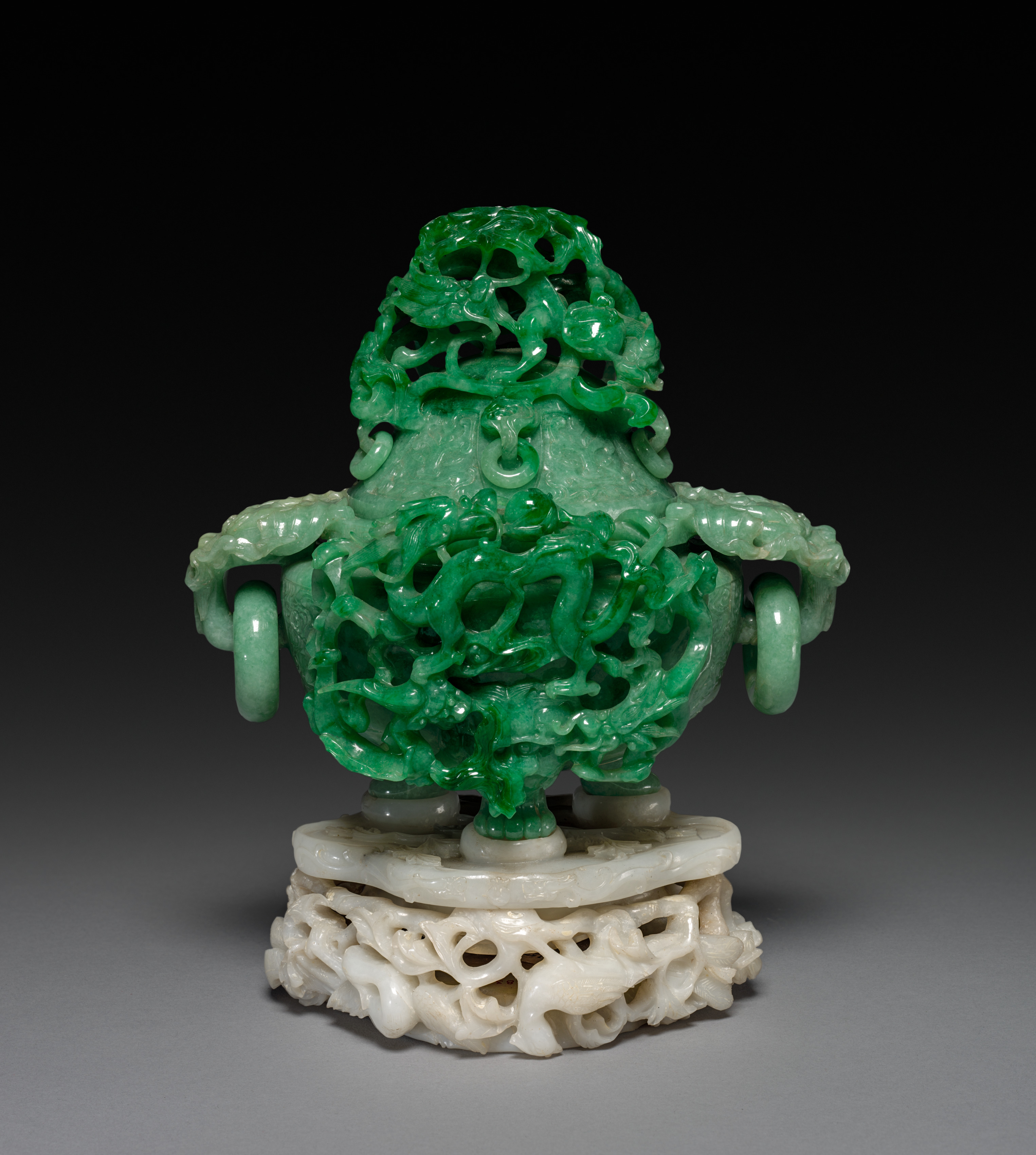 Green jade koro with lid and base. The koro is carved with a dragon. It has a removable lid on top. The base is white jade and has a reticulated design. The koro sits on a white jade base with a reticulated design. The koro itself sits on a small round white jade platform. The background is dark at top and light grey at bottom.