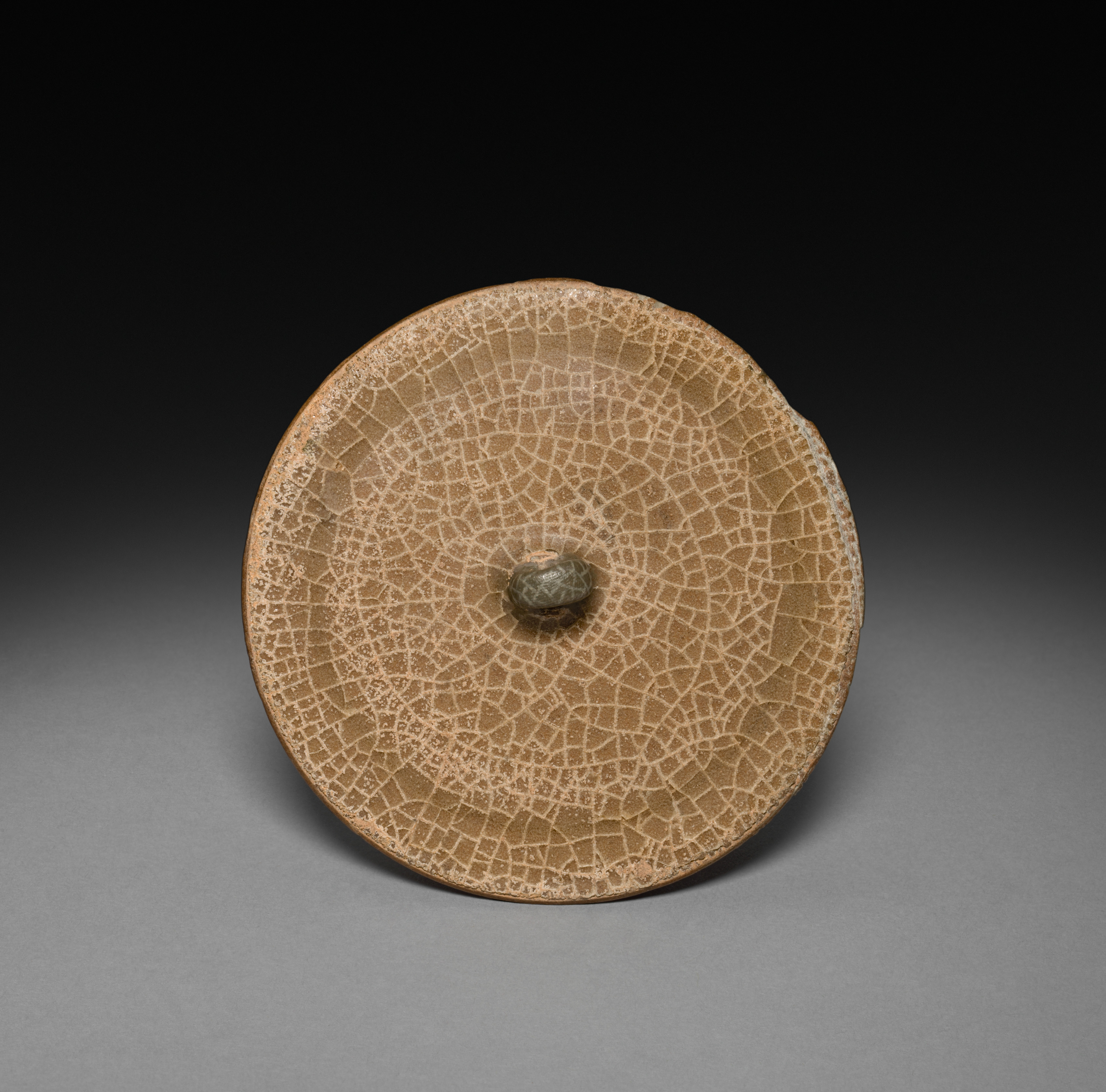 Brown ceramic lid with cracked pattern, round shape and small knob in the center. The lid has a brownish-tan color with a cracked glaze pattern. The knob in the center is small and rounded. The lid is sitting on a gray surface with a black background.