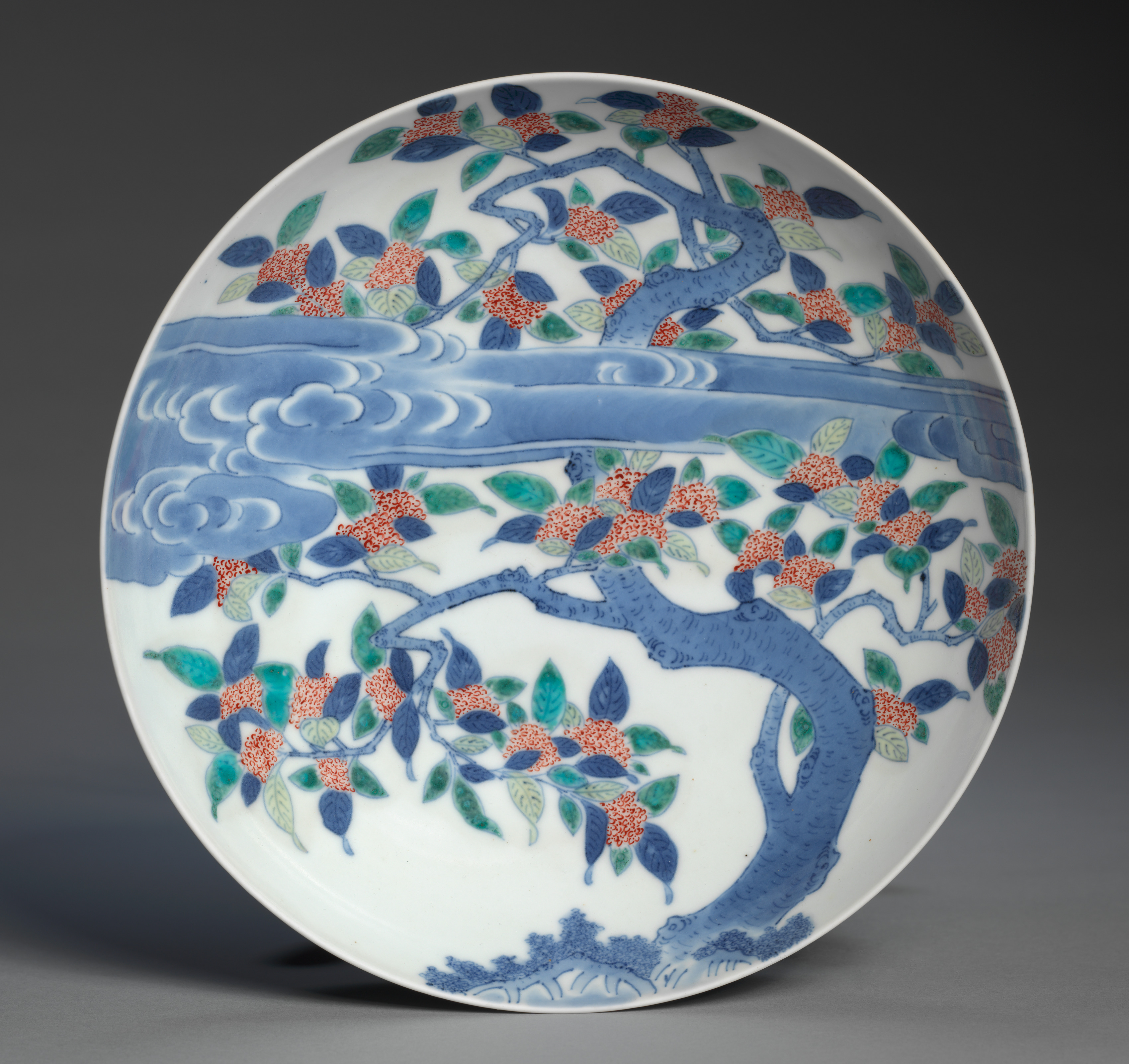 Round white dish with blue, green, and orange design. The dish features a blue tree with orange flowers and green leaves on a white background. Blue clouds are at the top of the dish. The tree trunk is thick and curved, with branches extending outwards. The flowers are small and clustered. The leaves are oval-shaped and pointed. The dish has a wide rim. The background of the image is dark gray. The dish is sitting on a light gray surface. The title of the dish is "Dish with Sweet Osmanthus and Cloud".