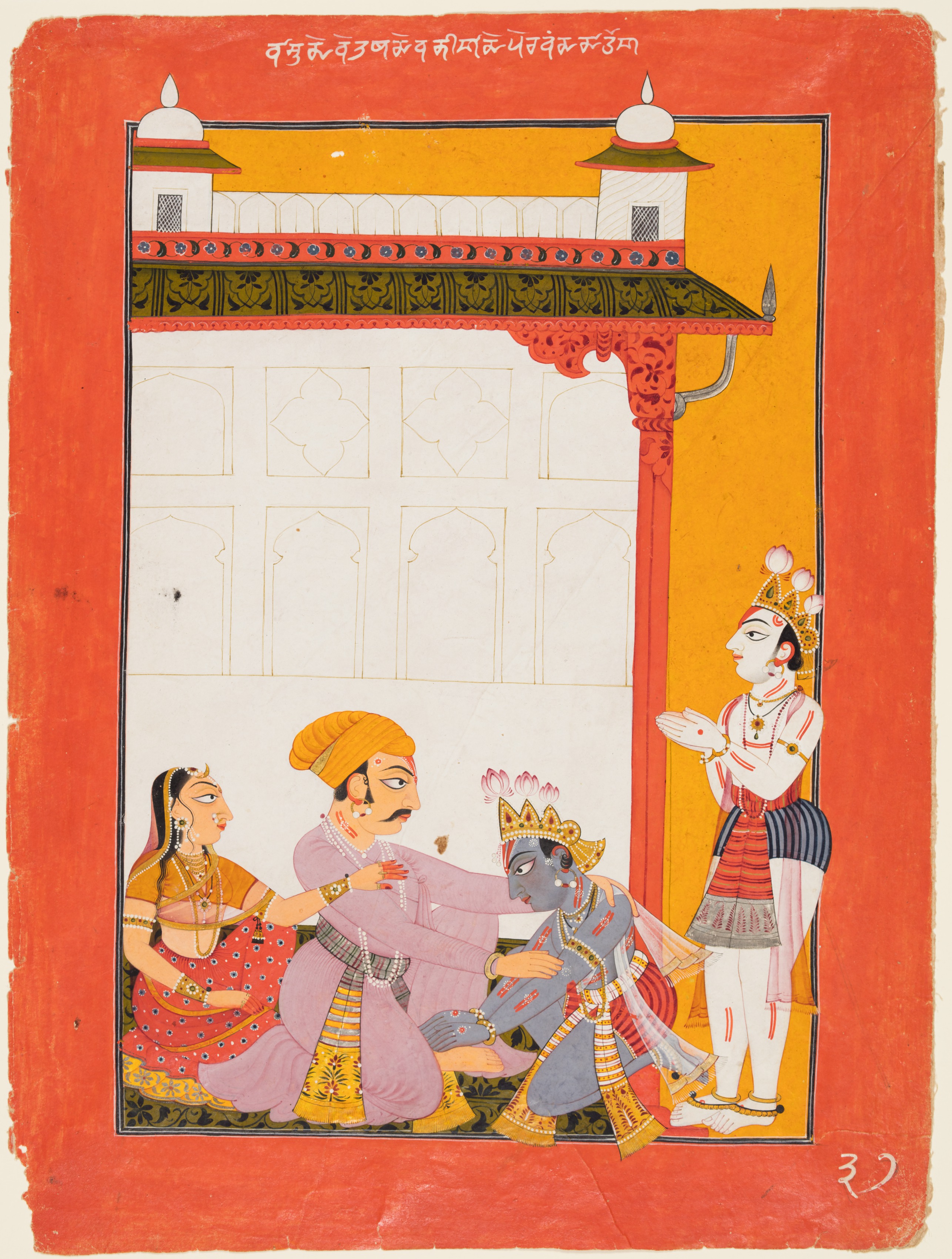 Painting of four people in traditional Indian clothing. A woman with brown skin and long dark hair wearing a red and gold dress sits on the left. A man with brown skin and a yellow turban and pink clothing sits to her right. A man with blue skin and a crown on his head wearing a blue robe kneels to the right of the man in pink. A man with white skin and a striped cloth around his waist stands behind him. The people are indoors with a white wall and an ornate gate behind them. The border around the painting is red.