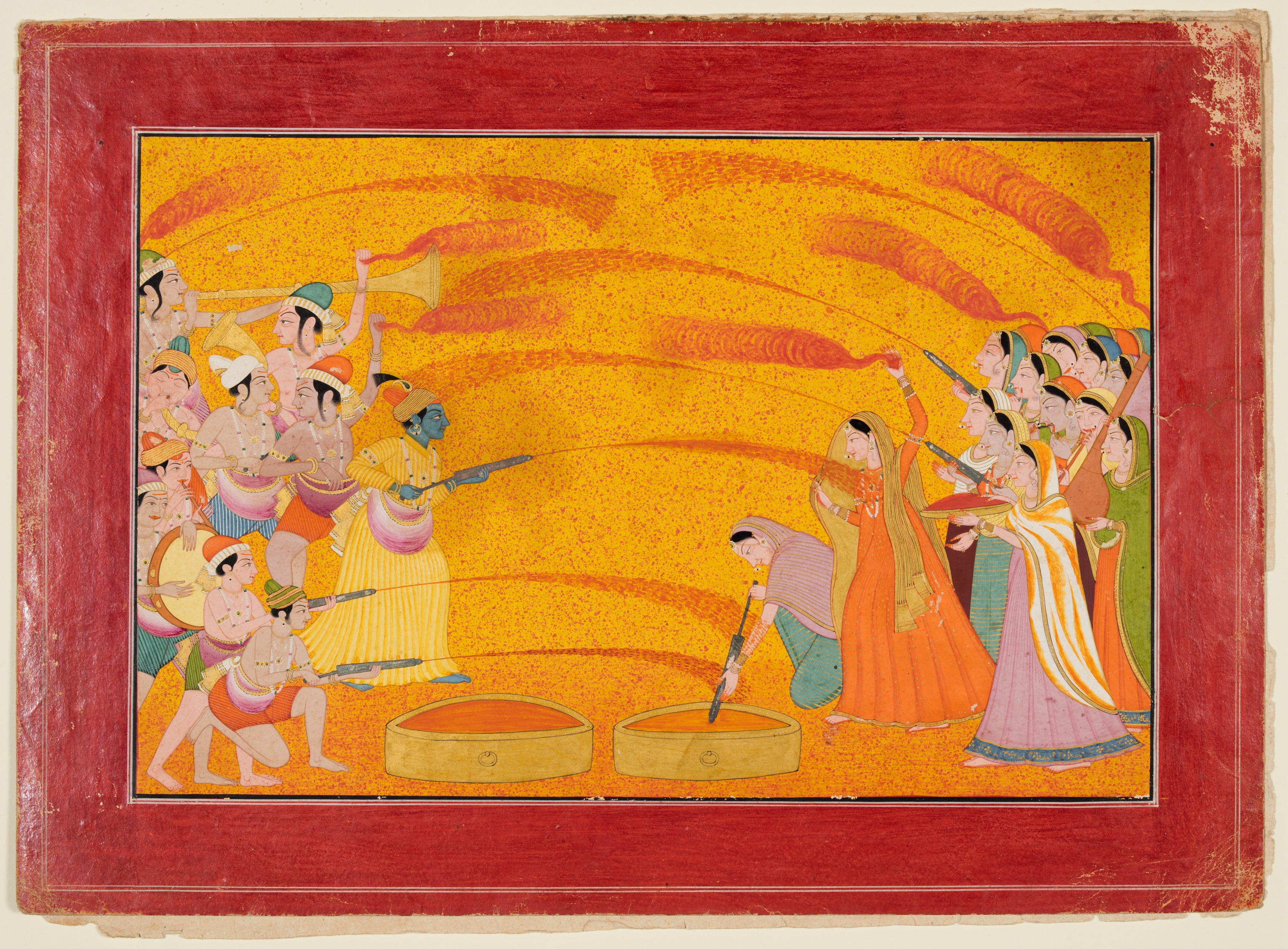 A colorful painting depicts a scene from "Krishna Celebrates Holi". The artwork features a red border around a central yellow scene with swirling orange lines. Two large baskets of orange powder are on the ground. On the right side, a woman wearing a long orange dress with a beige shawl and a woman wearing a pink dress with yellow and white stripes are spraying colored powder from syringes. A group of women stand beside them, smiling and watching. A man crouches by a basket, preparing or dipping a syringe. On the left side, a group of mostly shirtless men, some wearing head wraps or turbans, play drums or spray colored powder. A blue-skinned man wearing a yellow and white striped dhoti and a green head wrap holds a horn. The painting is by an unknown artist.