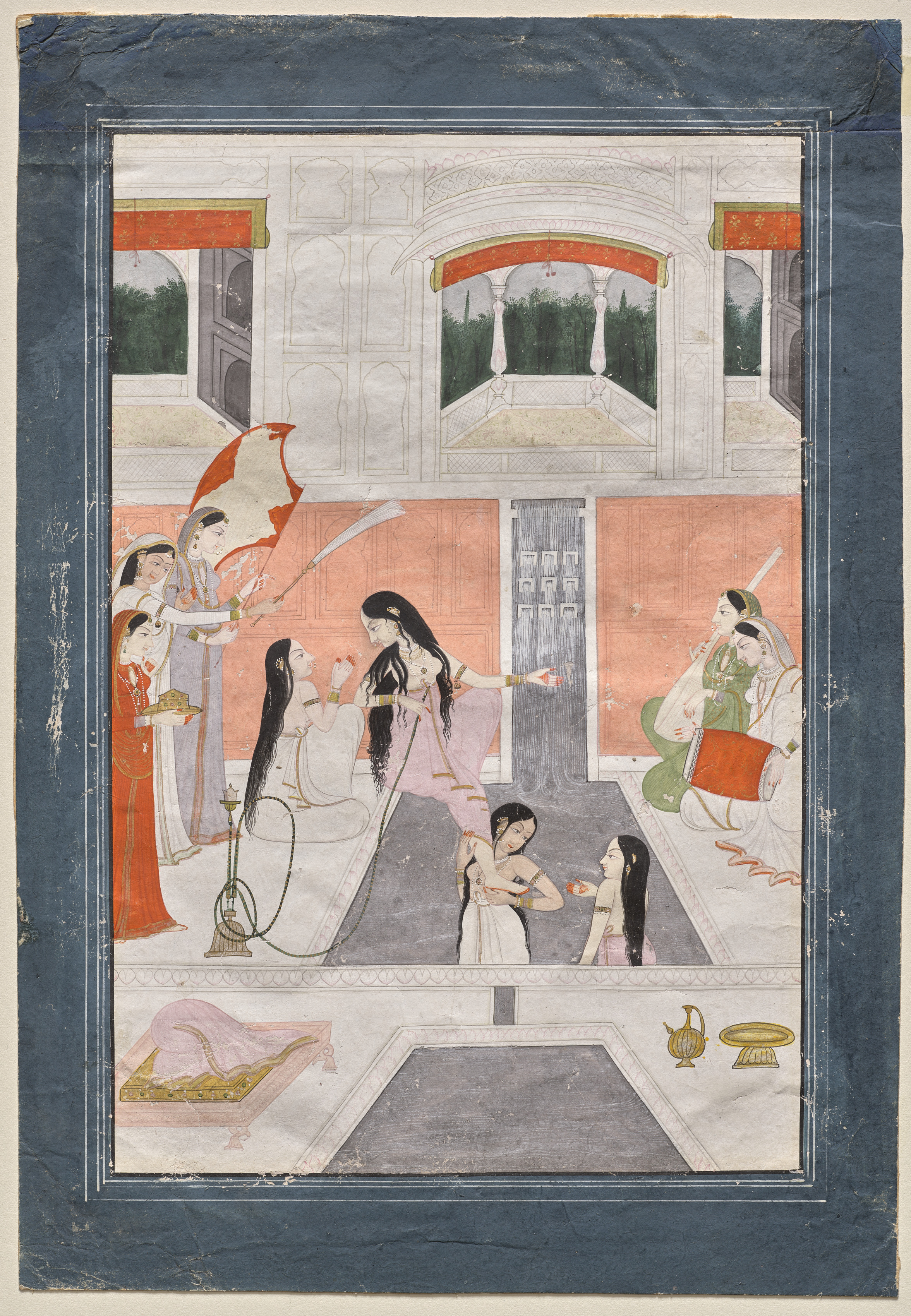 The painting depicts a scene of palace women enjoying music by the side of a cascade. The scene is set indoors, with a large white and pink building in the background. The building has three openings with red and gold awnings, and green trees are visible through them. Inside the building, there is a gray door and a white wall with a decorative design. Seven women are present in the scene. One woman sits on the floor, smoking a hookah. Two women stand near her, one holding a plate. Another woman sits on a low platform, covered with a pink cloth. On the left side, two women stand, one holding a fly-whisk and the other a sword. On the right side, two women sit, one playing a drum. In the foreground, on the right, there are two small gold objects, possibly a lamp and a dish. The painting is framed in dark blue and has a white border. The artist's style suggests it is a traditional Indian painting.