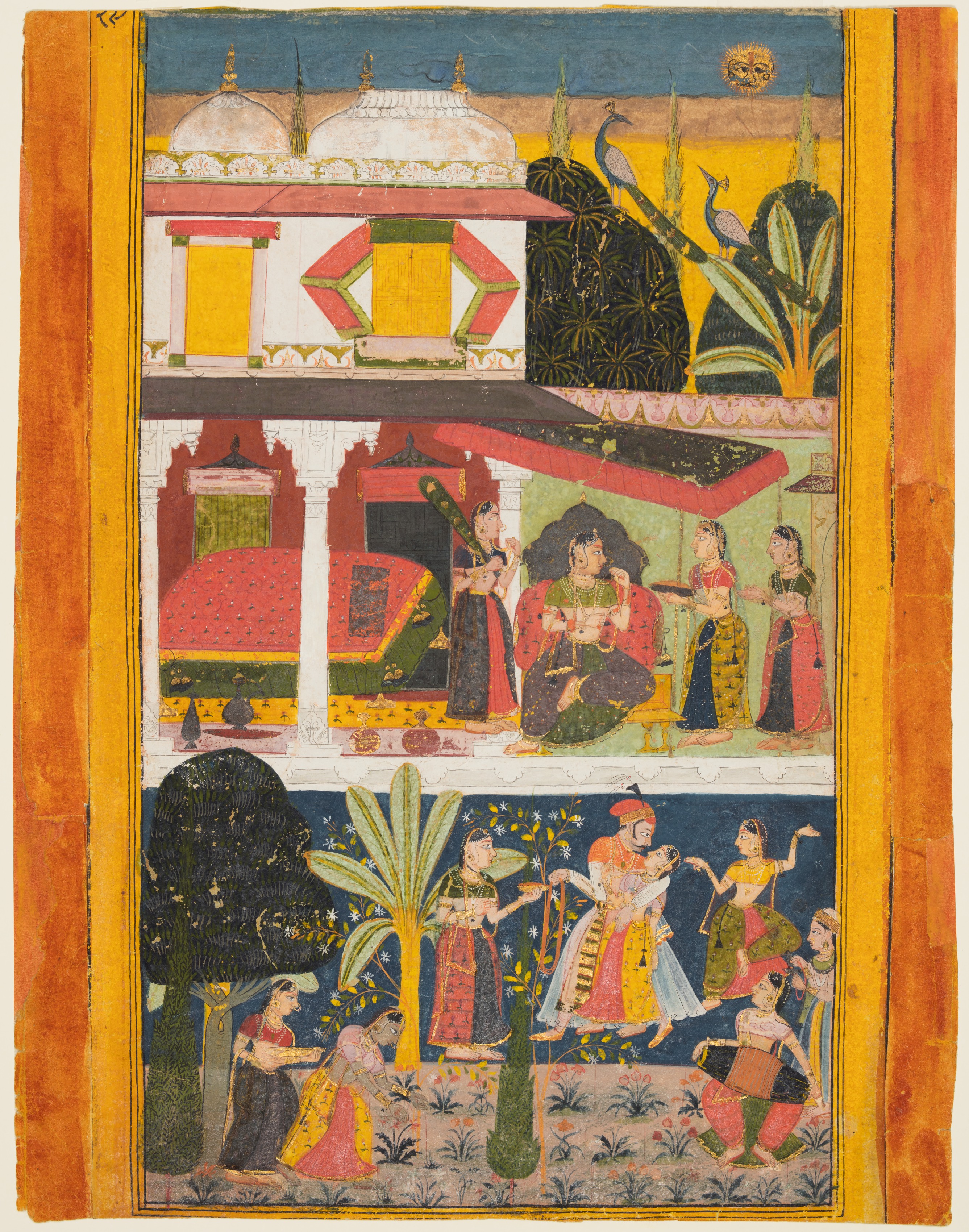 The image depicts a vertical painting divided into three horizontal sections. The top section shows a white building with two domes and a red roof, set against a blue sky with a sun and a peacock on a tree. The middle section features a woman in a black and green dress sitting on a low platform, surrounded by four other women in various colored dresses. The bottom section shows a group of people in colorful dresses dancing and walking in a garden with trees and flowers. The entire painting is framed by a yellow border on either side, with a darker orange border on the left and right edges. The painting style is traditional Indian, with intricate details and vibrant colors. The scene appears to be a depiction of a heroine and her paramour, Malavi Ragini, from a Ragamala.