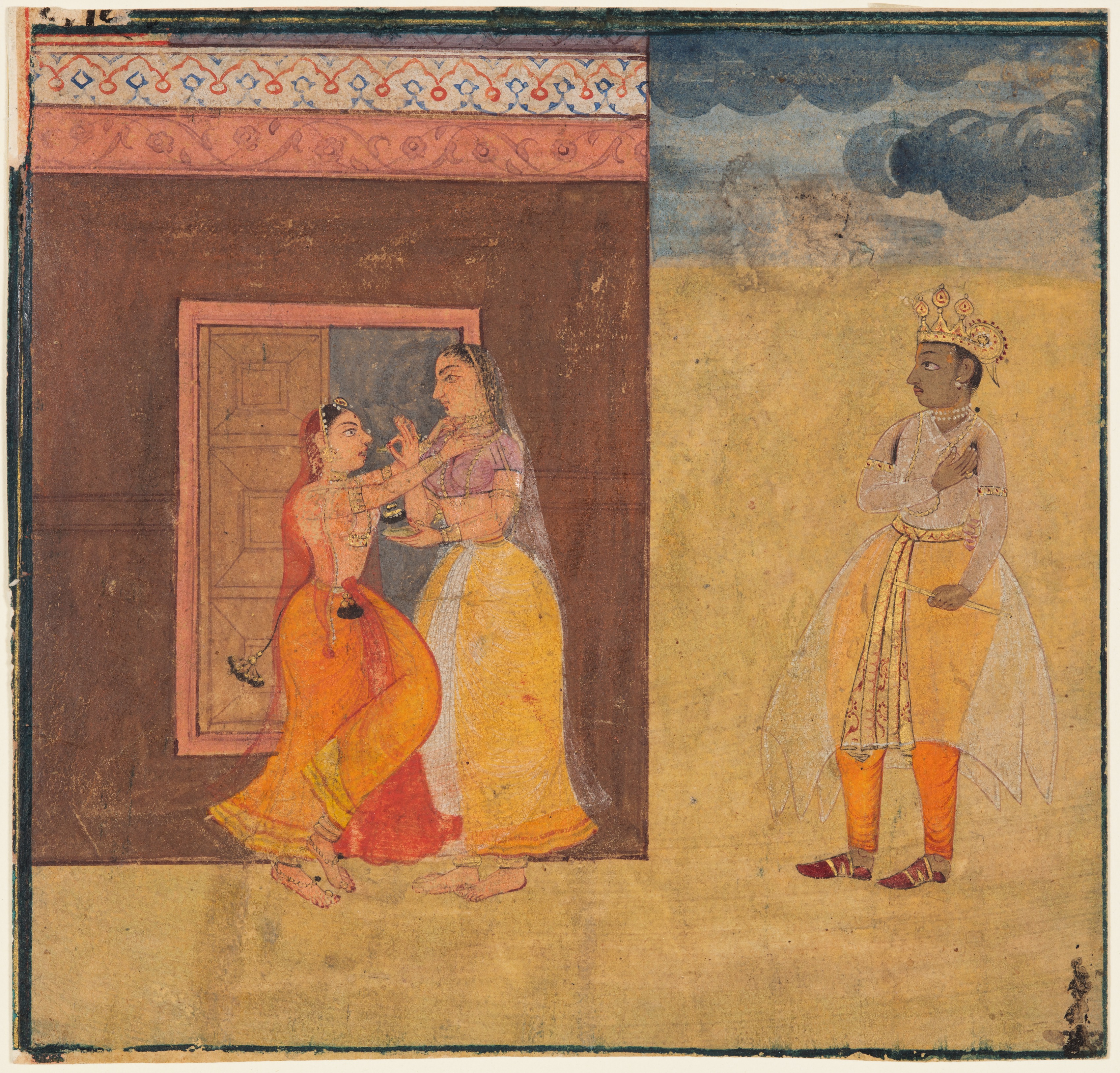 The image depicts a scene with three people. A woman wearing an orange skirt and no top stands facing a woman in a yellow dress with a white shawl; the woman in yellow sits on the floor. The woman in orange has her right palm raised near her face and her left hand on her hip. The woman in yellow has her hands together near her chest. A man wearing an ornate crown stands to the right; his hands are clasped over his chest. He wears a white shirt, orange pants, and a yellow skirt. The background on the left is a brown wall with pink trim around a door. The background on the right is a field with clouds. The image includes decorative elements at the top. The woman on the left is Krishna Abhisarika Nayika.