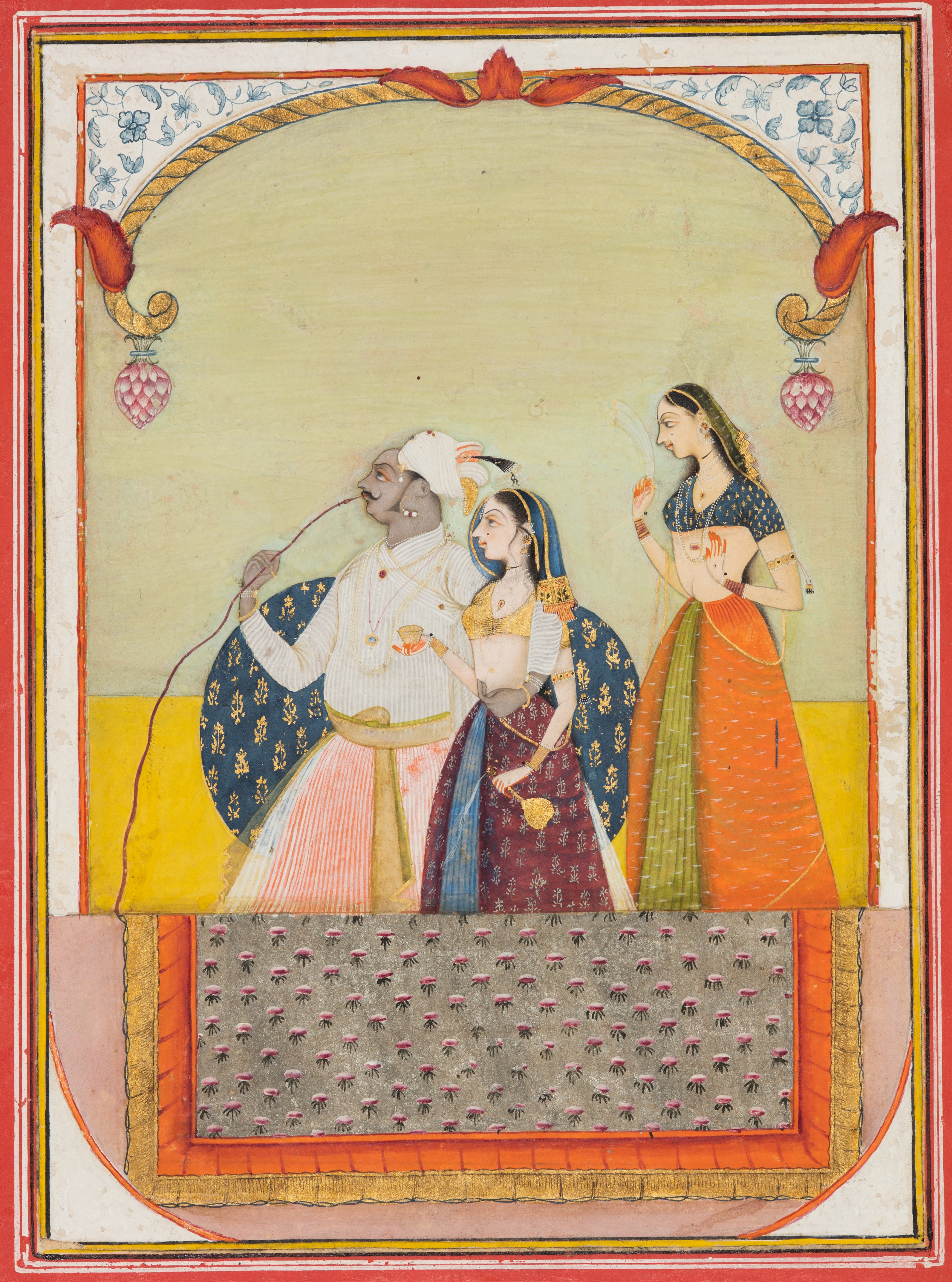 Painting of a man and two women. The man wears a white shirt, pink striped pants, a white turban, and a blue and gold shawl. He holds a curved stick. The woman to his left wears a blue headscarf, a white top, and a long red skirt with gold details. The woman to his right wears an orange skirt, green underskirt, and a blue top. They stand under an archway with a red and gold border. The archway has a white top with blue flowers and pink and white hanging ornaments. The background is yellow. A patterned gray area with pink flowers is at the bottom.