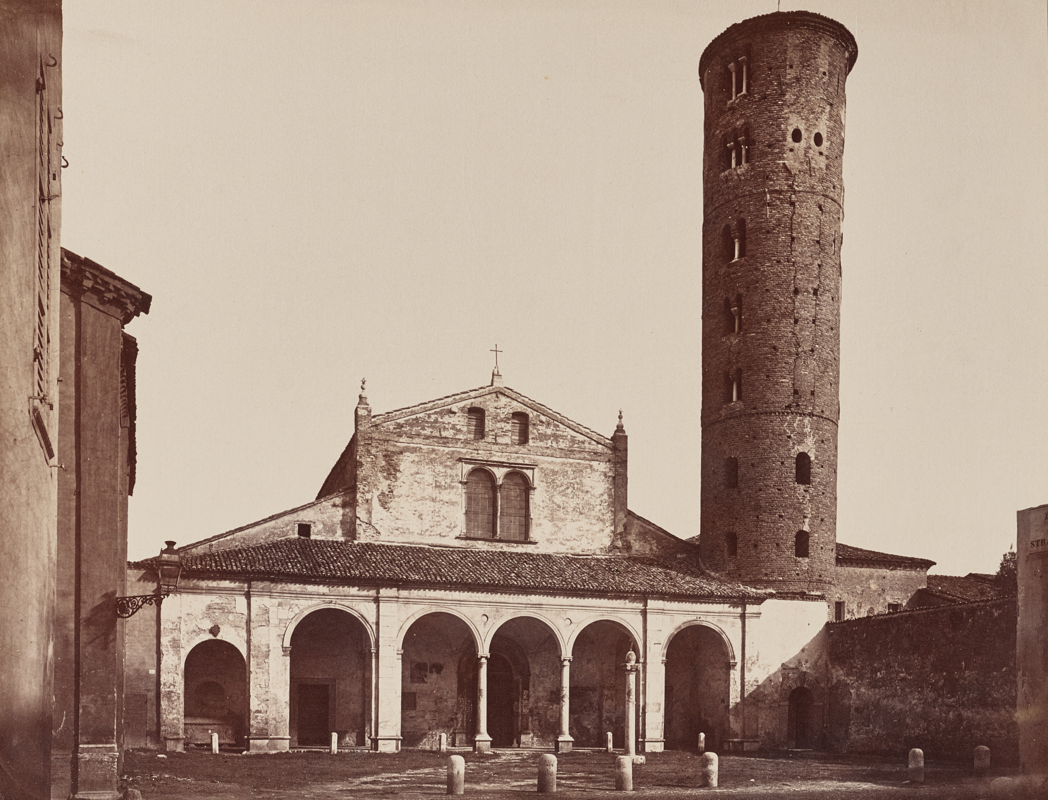 The image shows a church with a round tower. The church has a tiled roof and a facade with a triangular pediment. There are three arched doorways across the front, each supported by a pair of columns. Above the doorways, there are three arched windows. A cross sits atop the pediment. To the right of the church is a tall, round tower made of brick with small windows. The tower has a flat top. The buildings appear old and weathered. There are several bollards in front of the church. The sky is clear and light-colored.