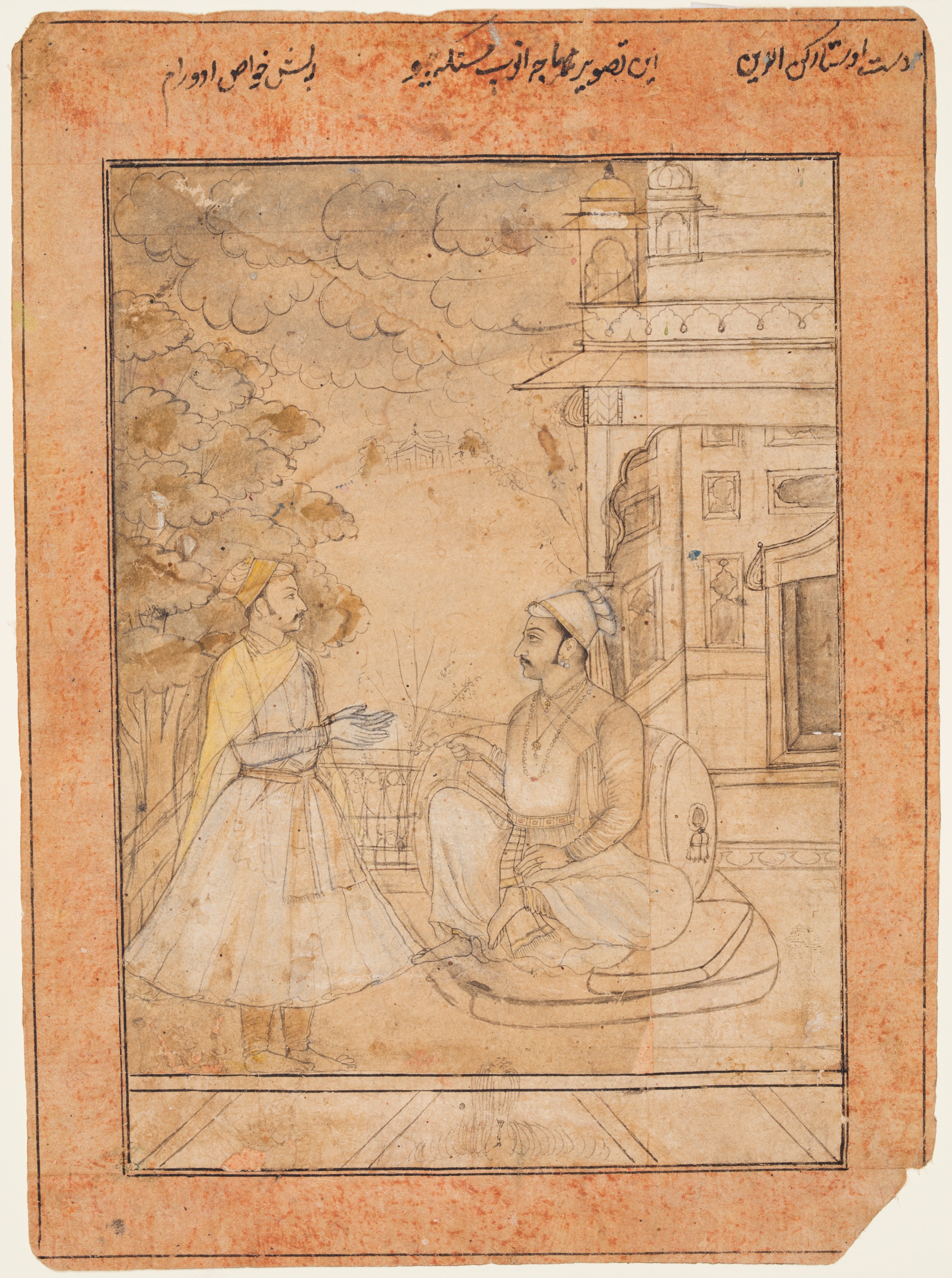 An illustration on aged paper with a reddish-brown border, depicting two men in traditional attire. The man on the left wears a yellow turban and shawl over a white outfit, with hands outstretched. The man on the right sits cross-legged on a low seat, dressed in white with a turban. A building and trees are in the background, with clouds above. The scene is framed by a thin black line and surrounded by a border with foreign script.